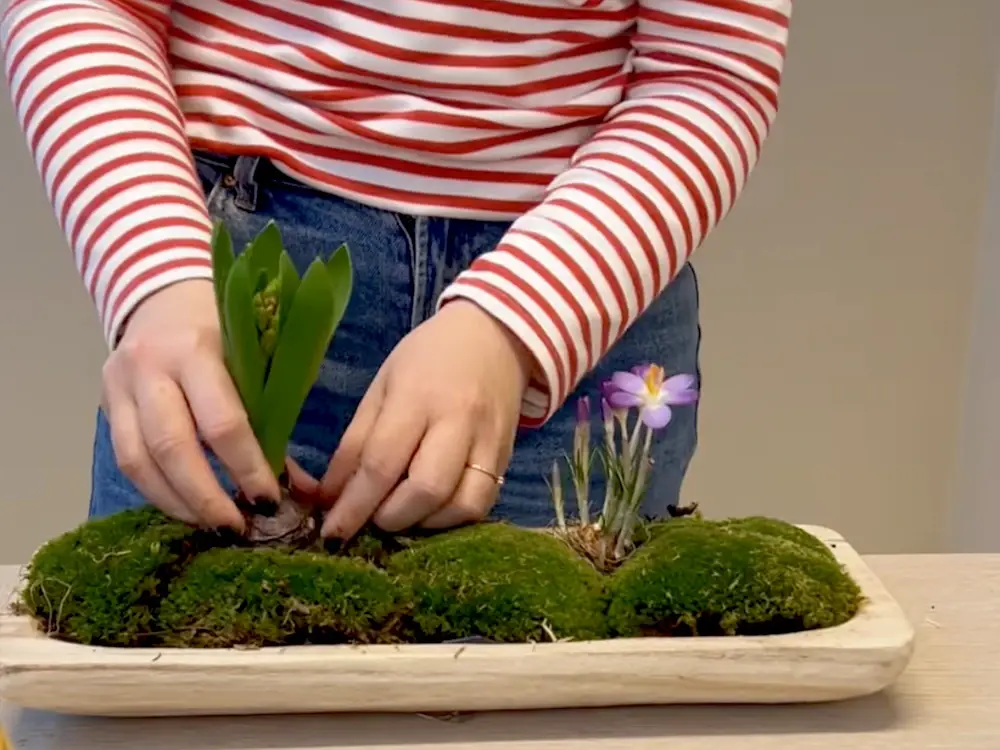 In deze tweede stap, gaan we onze blanco (oftwel groen) canvas aankleden. We nemen hiervoor verschillende bloembollen. Wij kozen voor krokussen en een hyacint. Plaats de bloembollen in pot nog even in een laagje water zodat ze extra water opnemen. Haal ze hierna uit de pot en plant de bloembollen (met wortel) voorzichtig tussen de stukken mos.