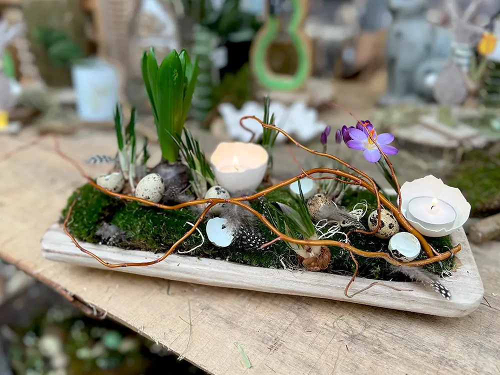 Nu is het tijd om een grote dosis lentekriebels toe te voegen. We beginnen met enkele eieren te nemen en deze open te breken. Wij kozen voor ganzeneieren als grote eyecatchers. Met het lijmpistool kunnen we de eieren vervolgens vastkleven op het mos. Daarna voegen we paastakken toe voor een speelse toets. Om ervoor te zorgen dat ze niet steeds omvallen, bevestigen we ze met krammetjes. De laatste finishing touch zijn enkele kwarteleitjes of veertjes, die we opnieuw bevestigen met ons lijmpistool.