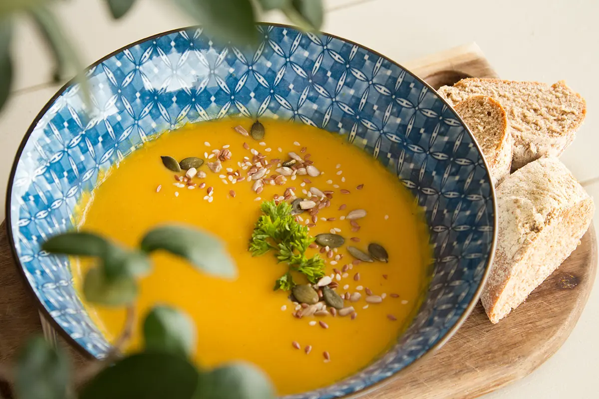 5. Serveer er de room apart bij. Werk de soep eventueel af met