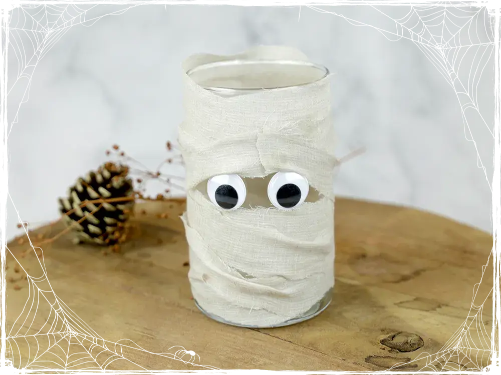 - Plaats je theelichtje in de vaas en kijk hoe je mummie helemaal opleeft. GRAAAAUWW!!!