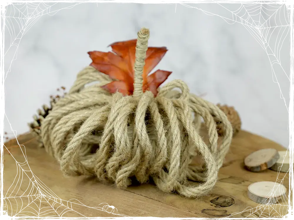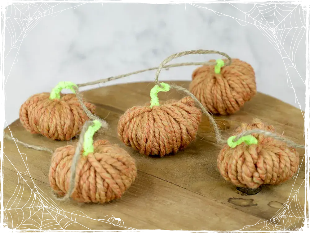 - Nadat je de voorgaande stappen enkele keren herhaald hebt, heb je voldoende pompoentjes om ze op het jute touw te rijgen en een vrolijke slinger te maken!