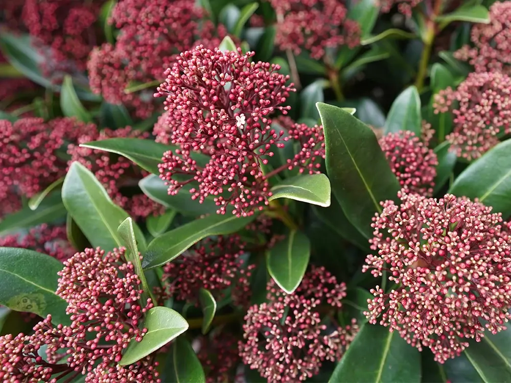 Naast zijn mooie glanzende, wintergroene bladeren biedt de Skimmia Japonica ons in de winter ook nog prachtige compacte bloemtrosjes met mooie knoppen. Ze voegt dus niet één maar zelfs twee kleuren toe aan onze tuin! Deze ultieme decoratieve plant voelt zich top in de (half)schaduw waar ze stilletjes kan verder groeien. Zorg er wel voor dat ze niet nat blijft staan, daar houdt ze niet van.