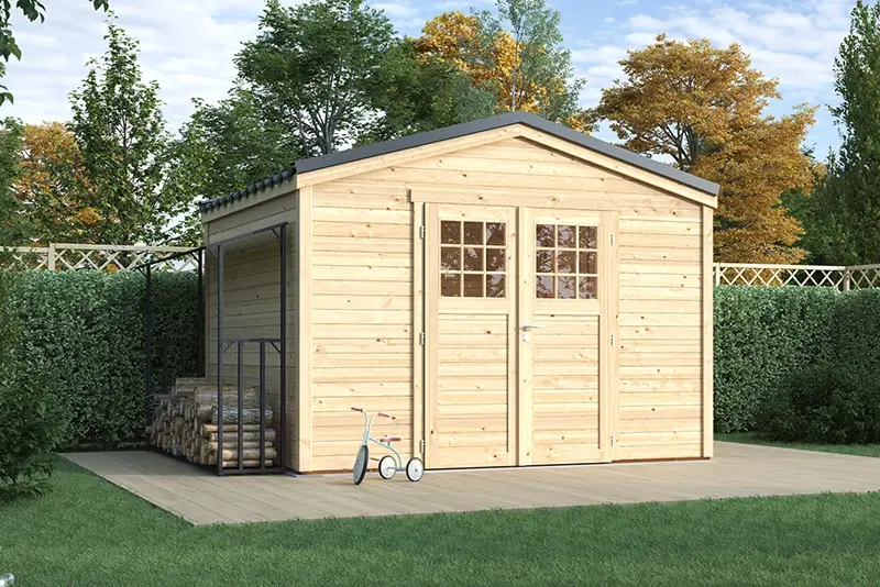 Het dak is voorzien van roofing en de wanden zijn opgebouwd uit onbehandeld vurenhout, volgens het principe van place & plug of houtstapelbouw. Kies voor een cottage stijl met opvallende rode dakshingles. Een tuinhuis met luifel biedt het voordeel van een gesloten opslagruimte of hobbyruimte, waarbij je tegelijkertijd kunt genieten van het buitenleven onder de overkapping, zelfs op regenachtige dagen.