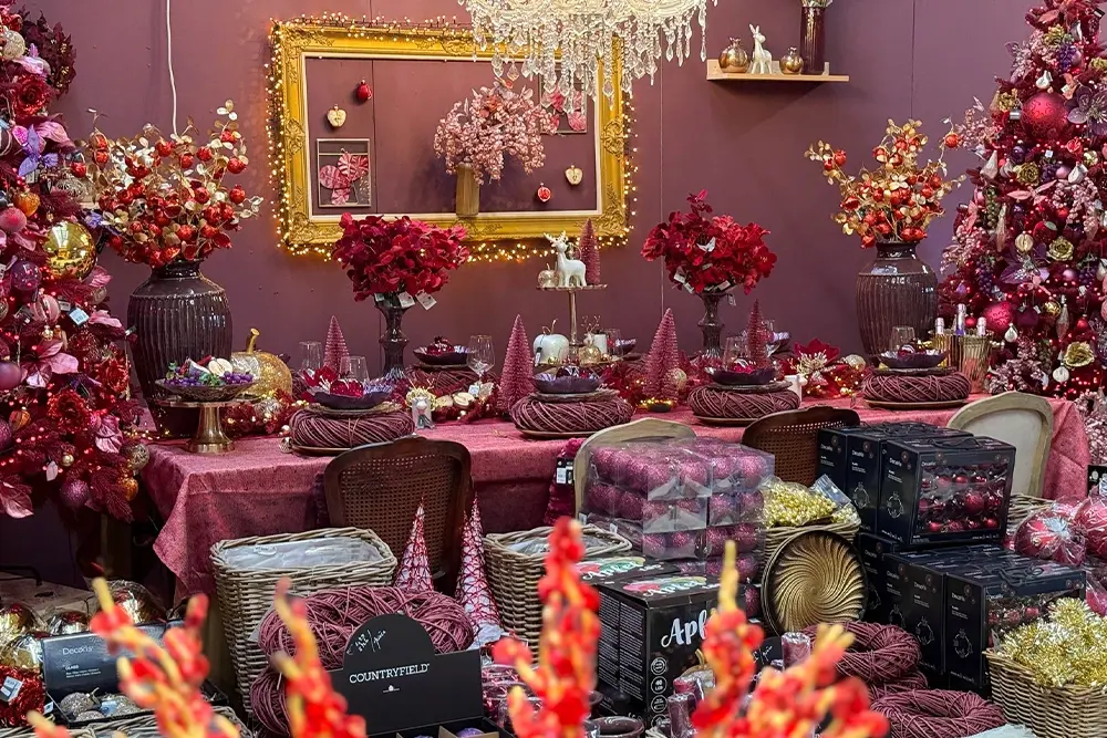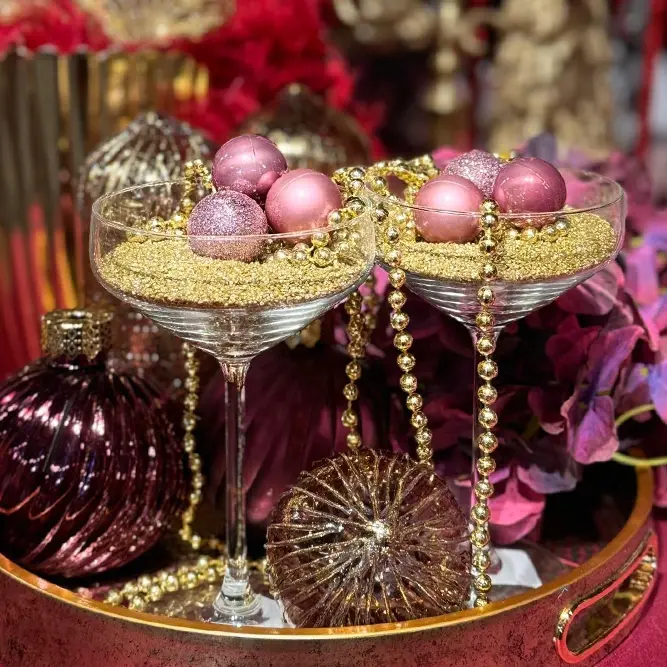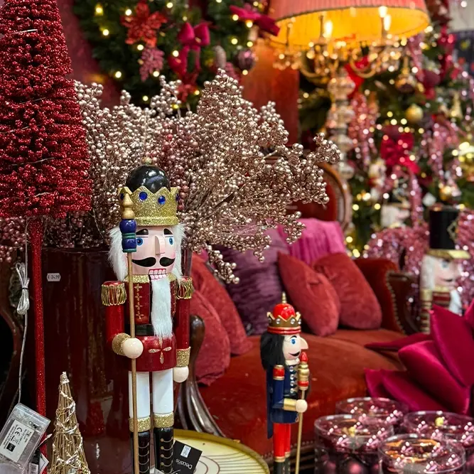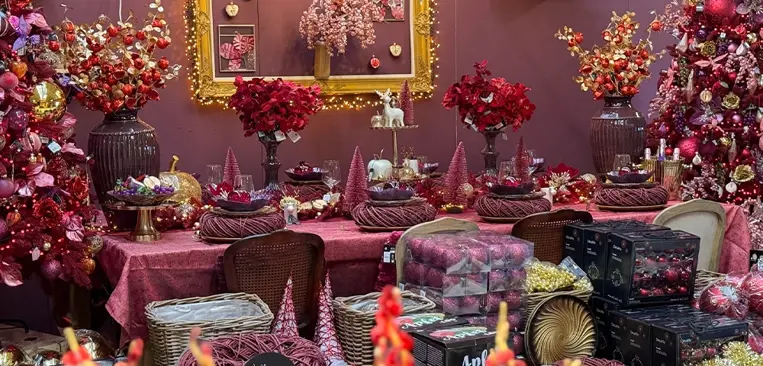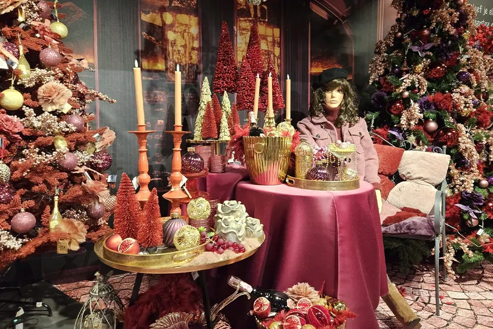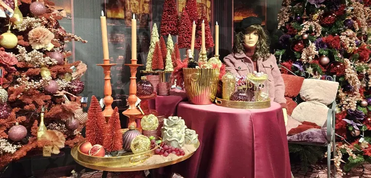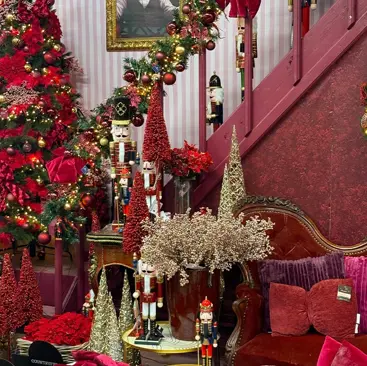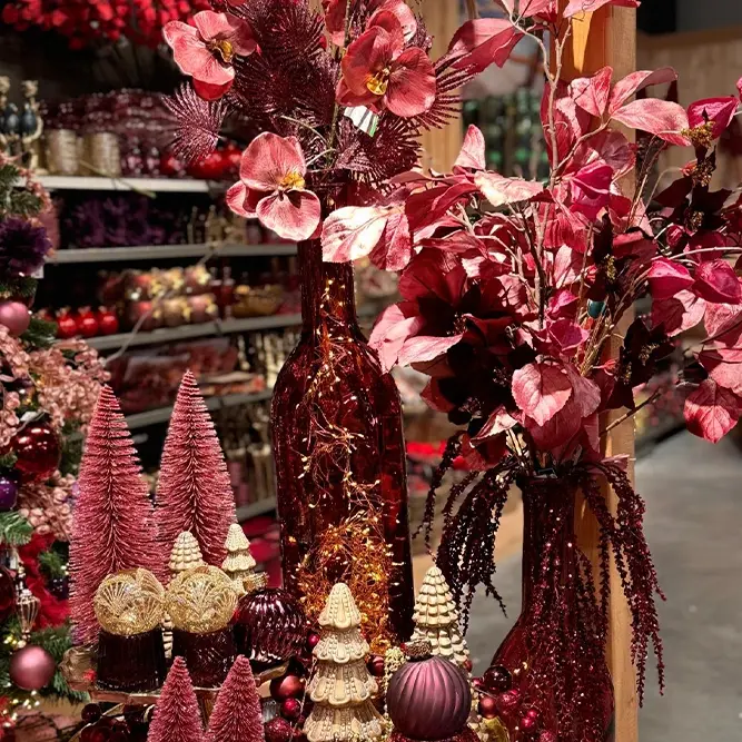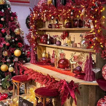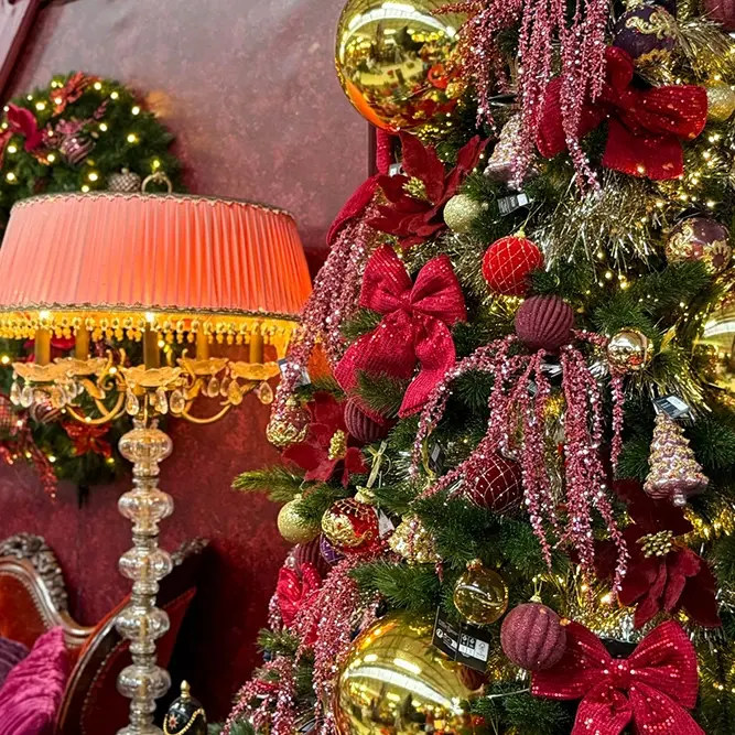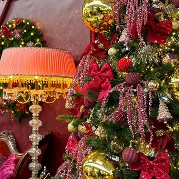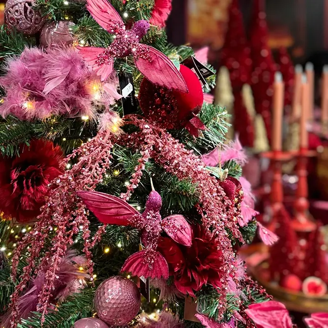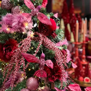 Burgundy Bloom staat voor luxe, glamour en warmte. Rode en roze kerstbomen, gouden details en velvet creëren een opvallende en stijlvolle sfeer die je direct betovert. Dit thema laat zien dat een kerstboom niet altijd groen hoeft te zijn en dat durf, elegantie en rijkdom perfect samengaan.