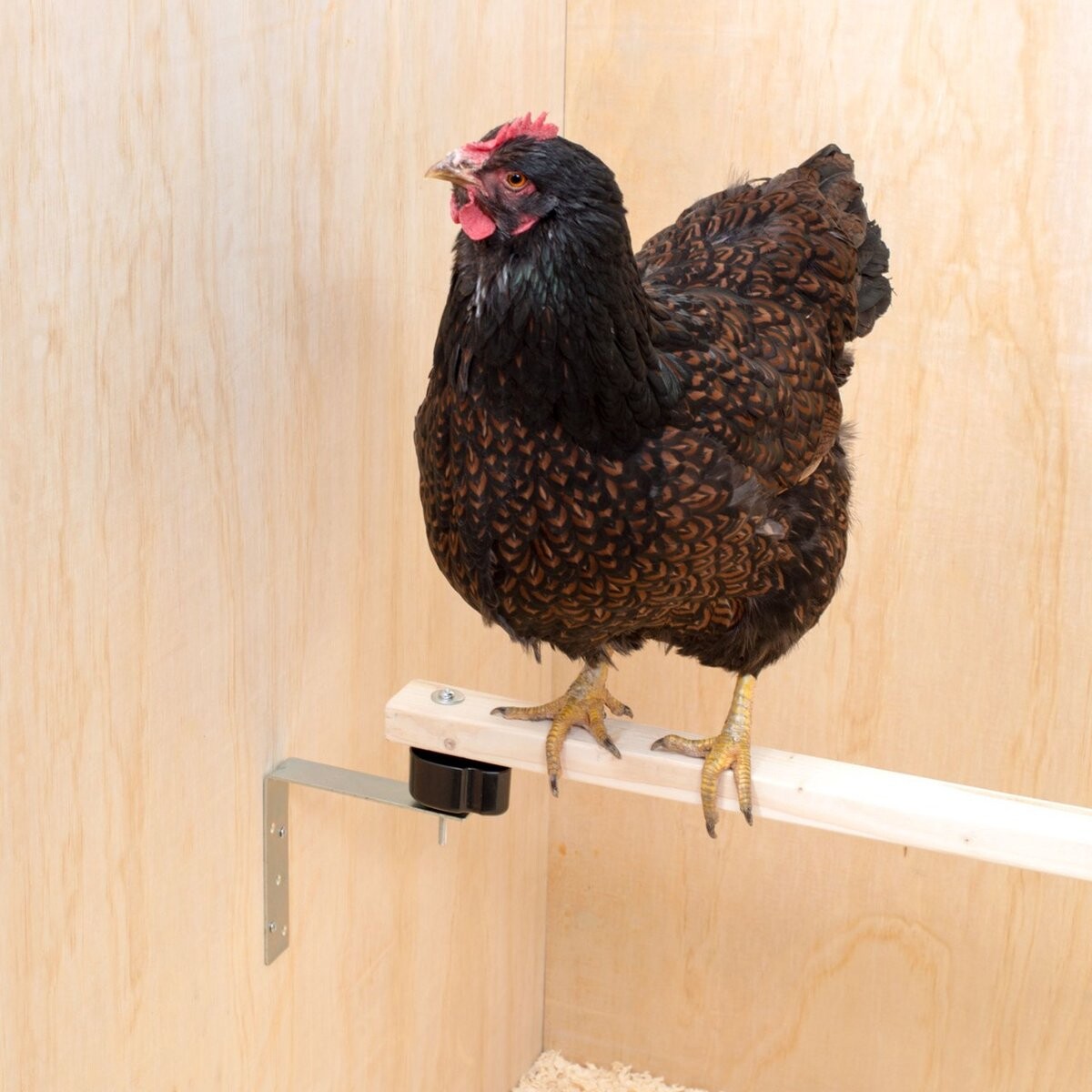 - Monteer de twee beugels zo op de zitstokken dat de afstand tussen de wand van het kippenhok en de zitstok ten minste 8 cm bedraagt.