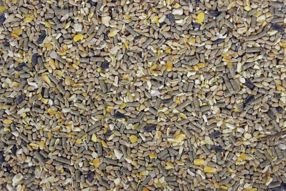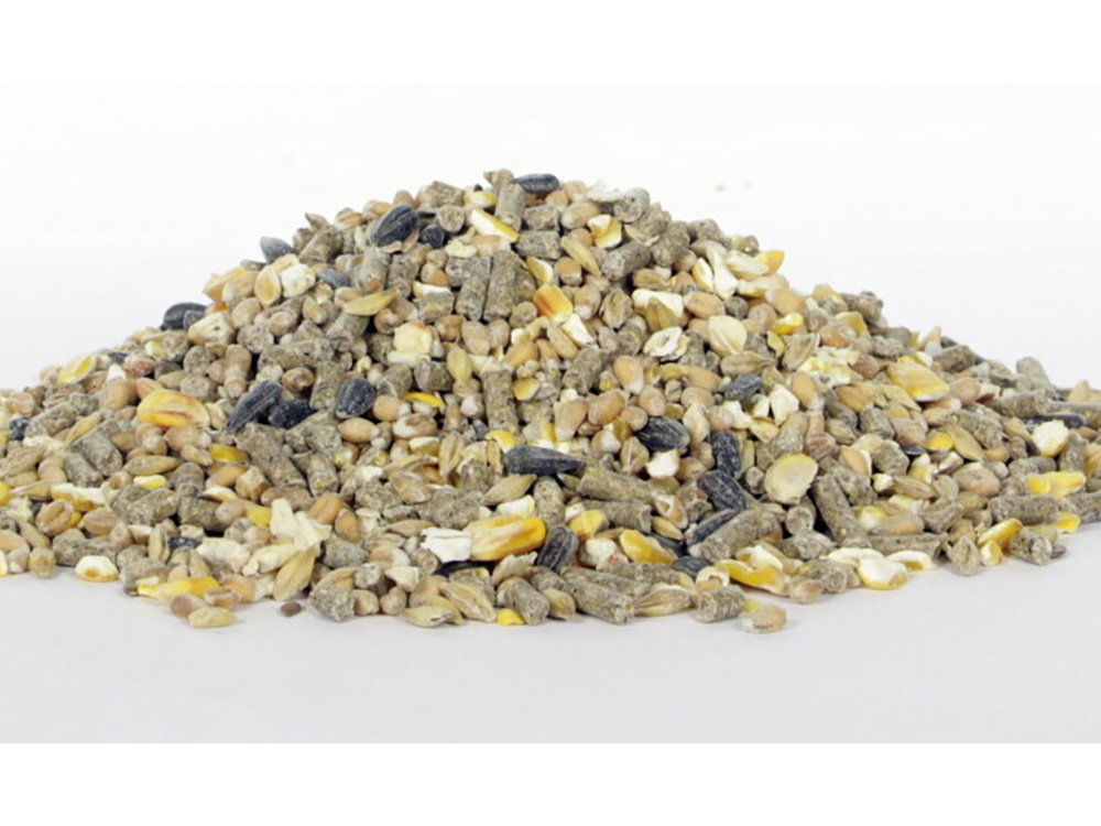 - Gewaarborgde samenstelling: korrels (Eko Sojaschilfers, Eko Mais, calciumcarbonaat, Eko Zonneschilfers, Eko tarwe, Eko tarwegries, Eko olie/vet, Eko sesamschilfers, natriumchloride) Eko tarwe, Eko gebroken maïs, Eko gerst, koolzure zeeschelpen, Eko zonne-bloempitten, Eko havervlokken, Eko lijnzaad, Eko sojaolie.