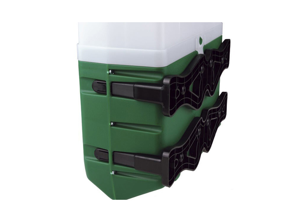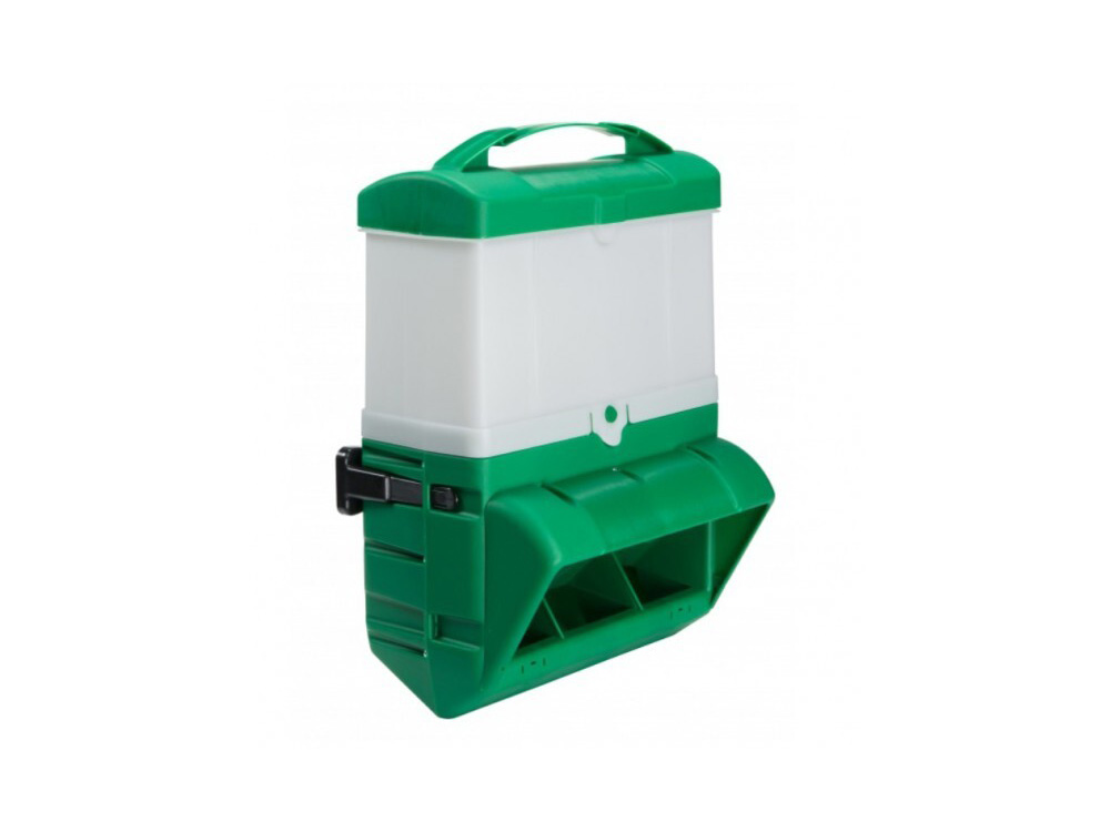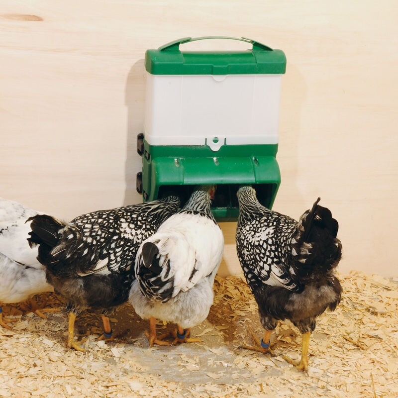 Dankzij een handig schuifsysteem bepaal je ook hoeveel eten er voor de kippen wordt vrijgegeven. Het groene kunststof deksel houdt het voeder droog.
