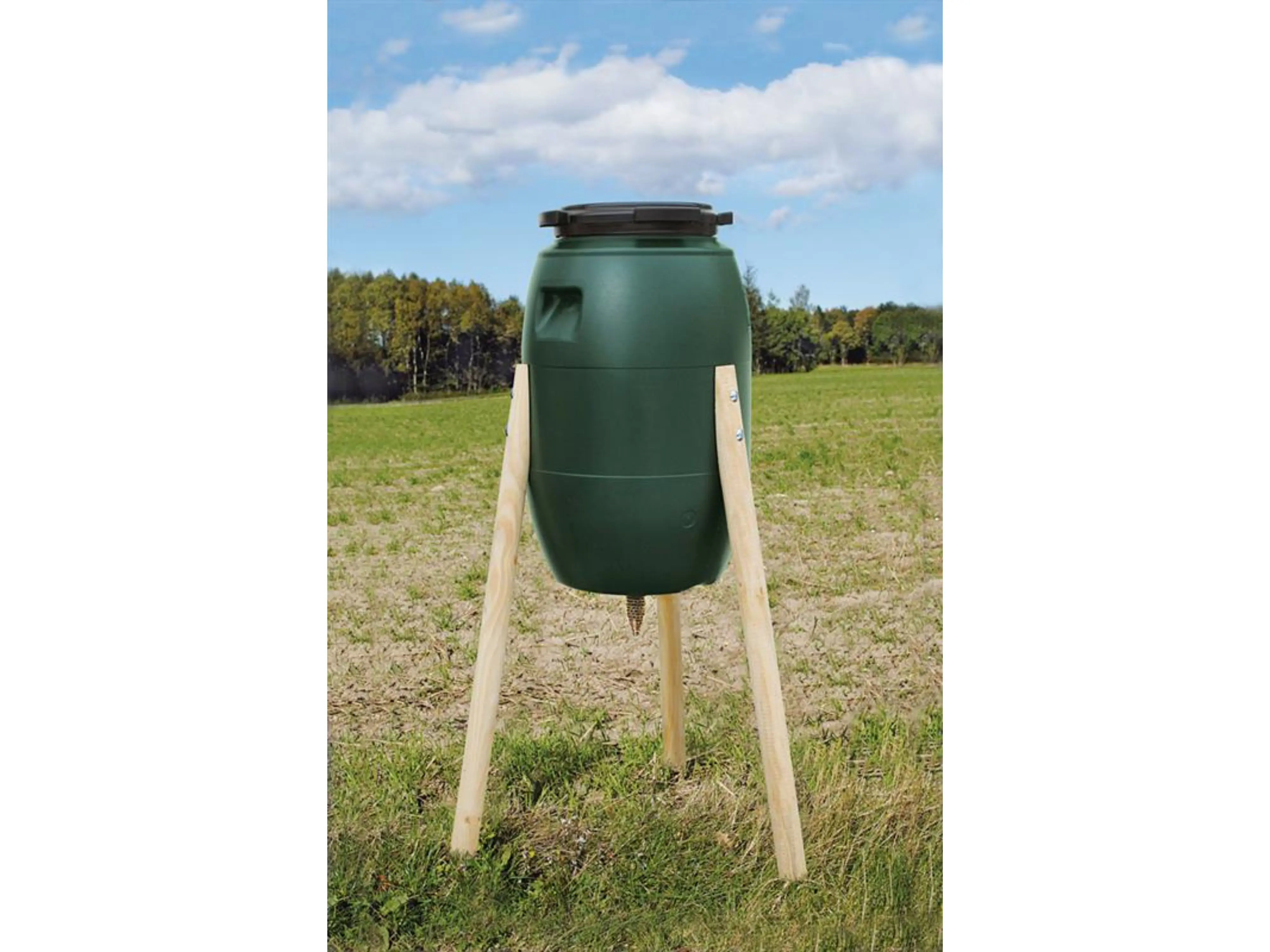 De ton met schroefdeksel hangt tussen drie stevige houten poten die met de bijgeleverde bouten aan de ton vast gemaakt worden.