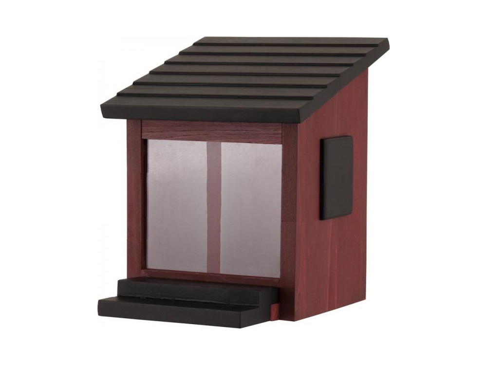 De Ekorrmatare wordt gevuld met noten of speciaal eekhoornvoer die voor de eekhoorn zichtbaar opgeslagen liggen achter grote ramen aan de voorkant. De eekhoorn zit op de uitstekende houten veranda en gebruikt z’n hoofd om het dak op te lichten om bij het voedsel te komen.Het eekhoornvoederhuisje is gemaakt van massief weerbestendig hout en is voorzien van een ophangblok voor montage tegen een muur of boom.