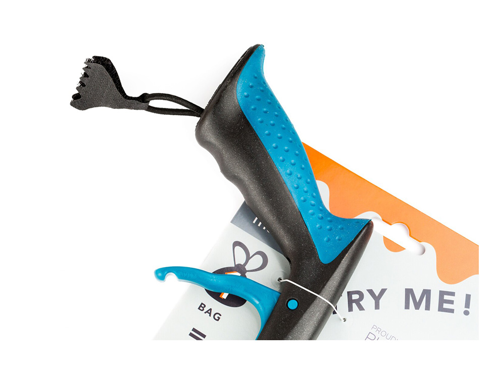Over het schepje kan je drie zakjes over elkaar aanbrengen. Je vouwt ze over de grijper heen en maakt ze boven de grijper vast met de voorziene rekkertjes. Wanneer je de hondenpoep verwijdert, kan je dankzij het doordachte design, meerdere hoopjes opnemen. Eenmaal het schepje vol is, kan je door de trigger aan het handvat te blokkeren de grijper gesloten houden terwijl je het eerste zakje losmaakt en dichtknoopt. Nadien deblokkeer je de trigger en het zakje kan zonder dat je het ooit hebt aangeraakt de vuilnisbak in. Er zijn nu nog steeds twee zakjes op de grijper aanwezig voor later gebruik.