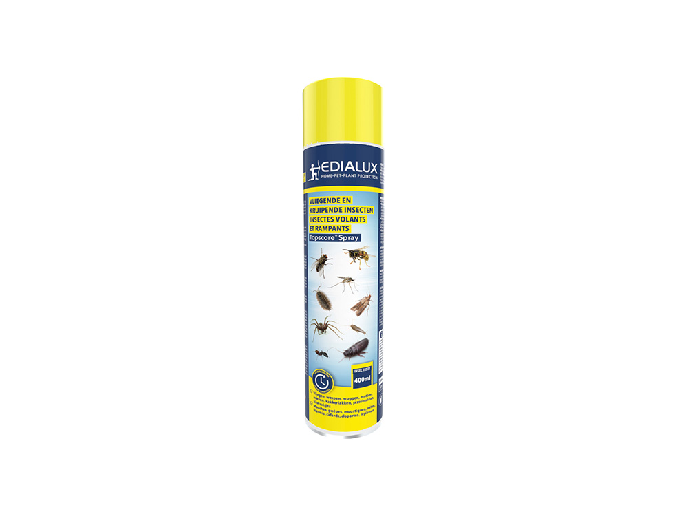 Topscore spray van Edialux bestrijdt vliegende en kruipende insecten in woon, werk-, en verblijfplaatsen. Het middel verdelgt snel en krachtig ongedierte zoals wespen, vliegen, muggen, motten, mieren, zilvervisjes, kakkerlakken, kevers, vlooien,... Het heeft een snelle aanvangswerking en een lange nawerking.