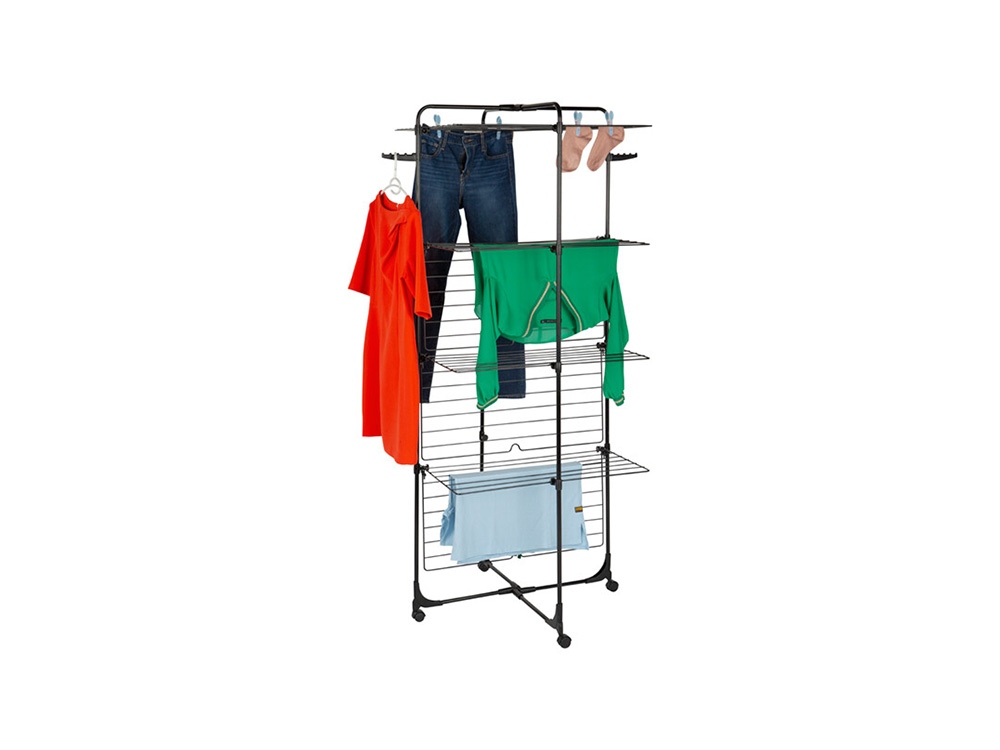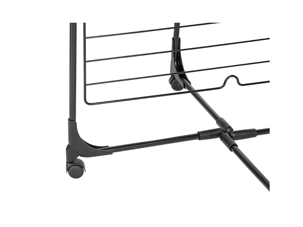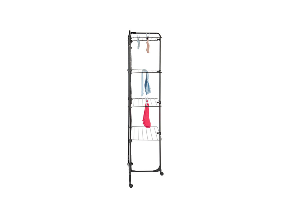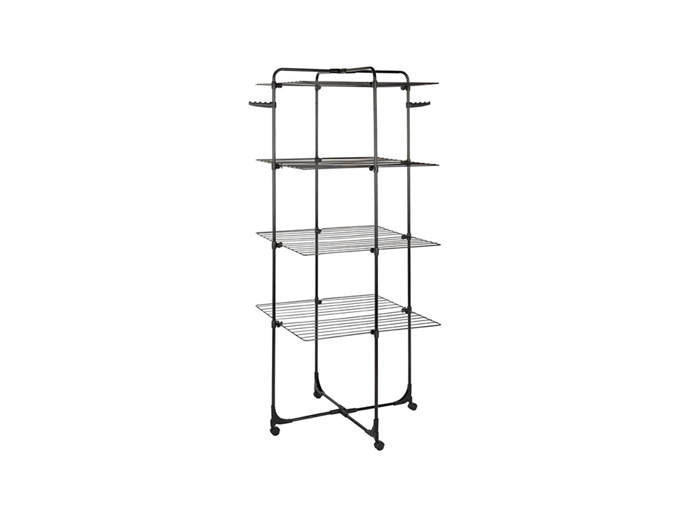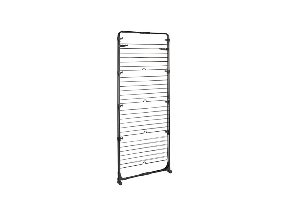 De heavy duty droogtoren Sara is een droogrek met 4 niveaus en 8 afzonderlijke plateaus. Het is ook half inklapbaar voor gebruik tegen een muur. Het droogrek rust op 4 stevige wielen zodat je het makkelijk kunt verplaatsen. Met de 40 meter drooglijn heb je meteen een groot droogoppervlak. Aan de bovenzijde zijn 2 ophanghaken voor kleerhangers voorzien.