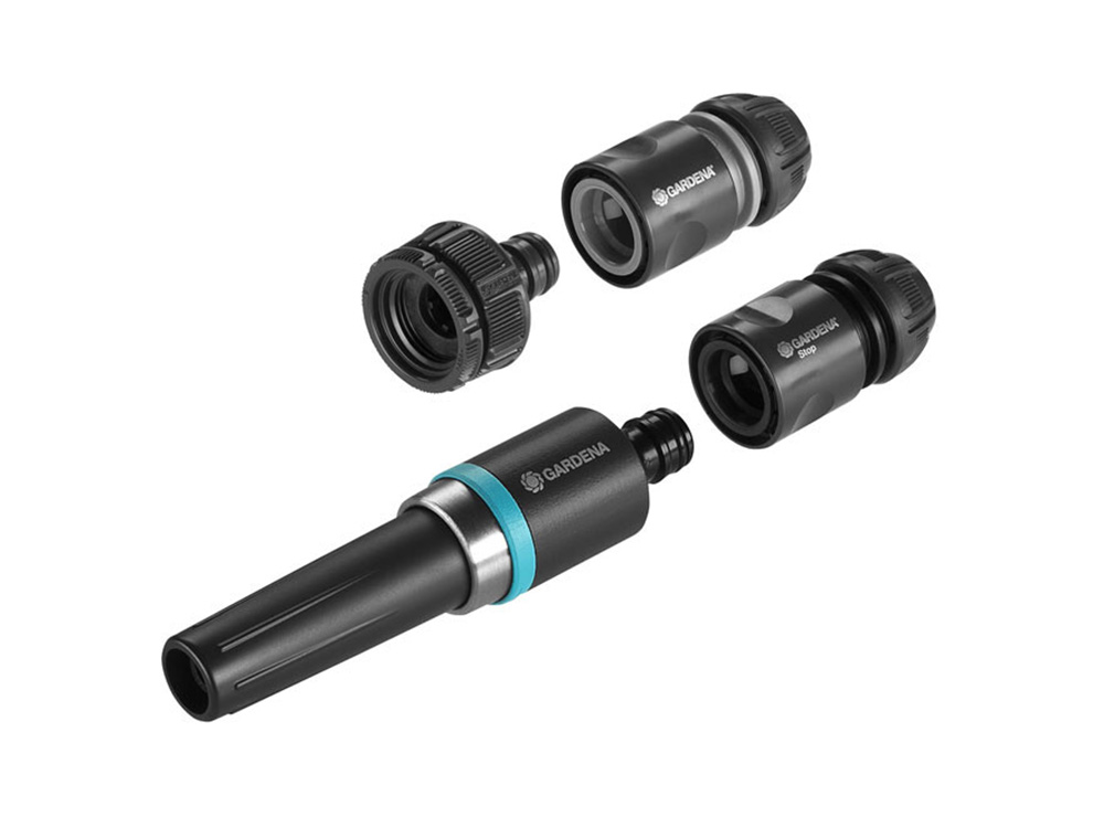 De Ecoline Basisset van Gardena met kraanstuk, adapter, slangstuk en reinigingssproeier met waterstop heeft twee verschillende mogelijkheden: een gebundelde straal voor schoonmaakwerk en een zachte sproeistraal voor het sproeien in de tuin. Het sproeipatroon is soepel aan te passen.