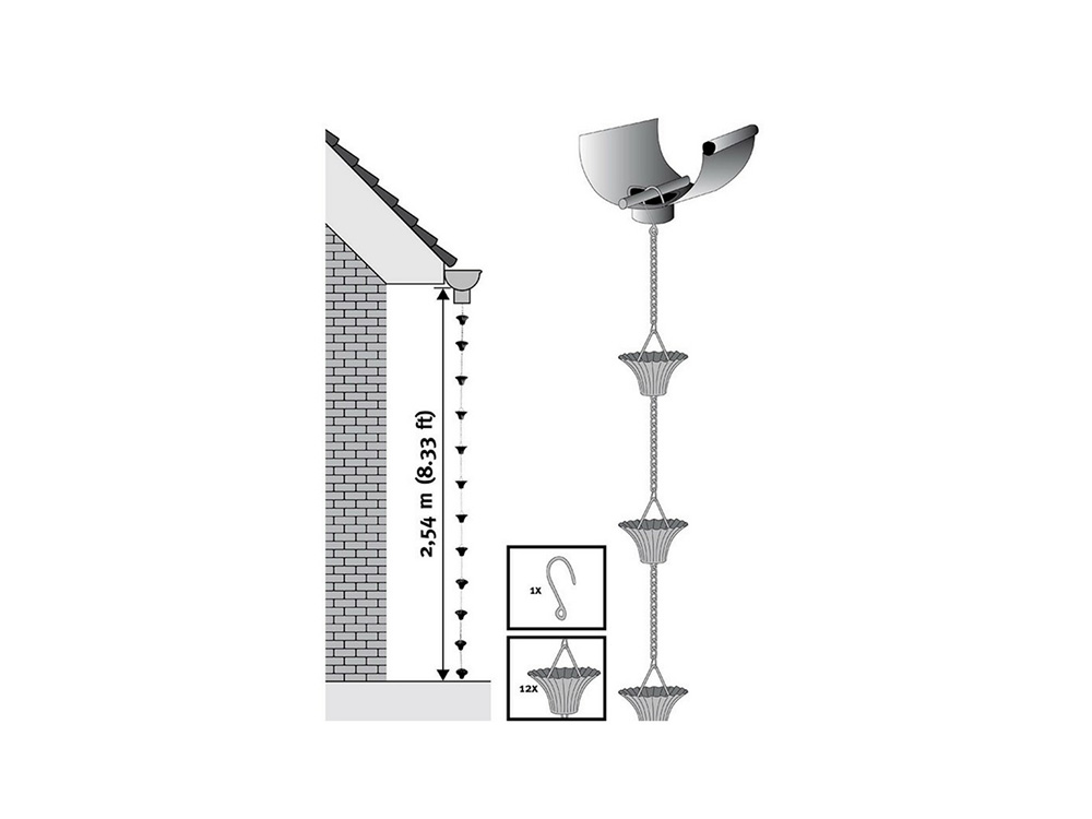 Het water kan onderaan de ketting eventueel worden opgevangen in een regenton of een waterpartij. Indien gewenst kan je meerdere kettingen onder elkaar hangen.