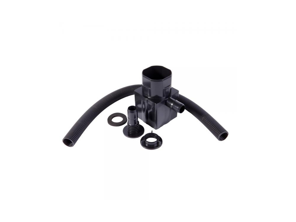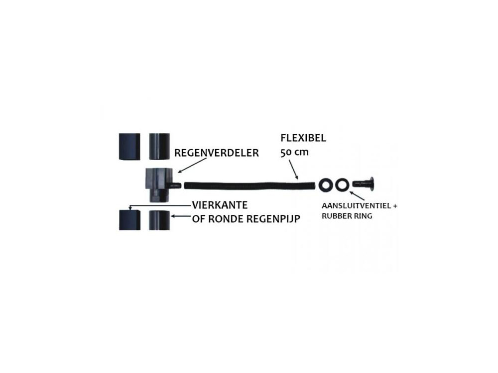 Het koppelstuk wordt met de regenton verbonden met een 50 cm lange kunststof flexibeldarm en een aansluitventiel dat op de zijkant van de regenton wordt geïnstalleerd. Sommige tonnen zijn reeds voorgeboord, bij andere modellen boor je zelf een gat (25 mm).