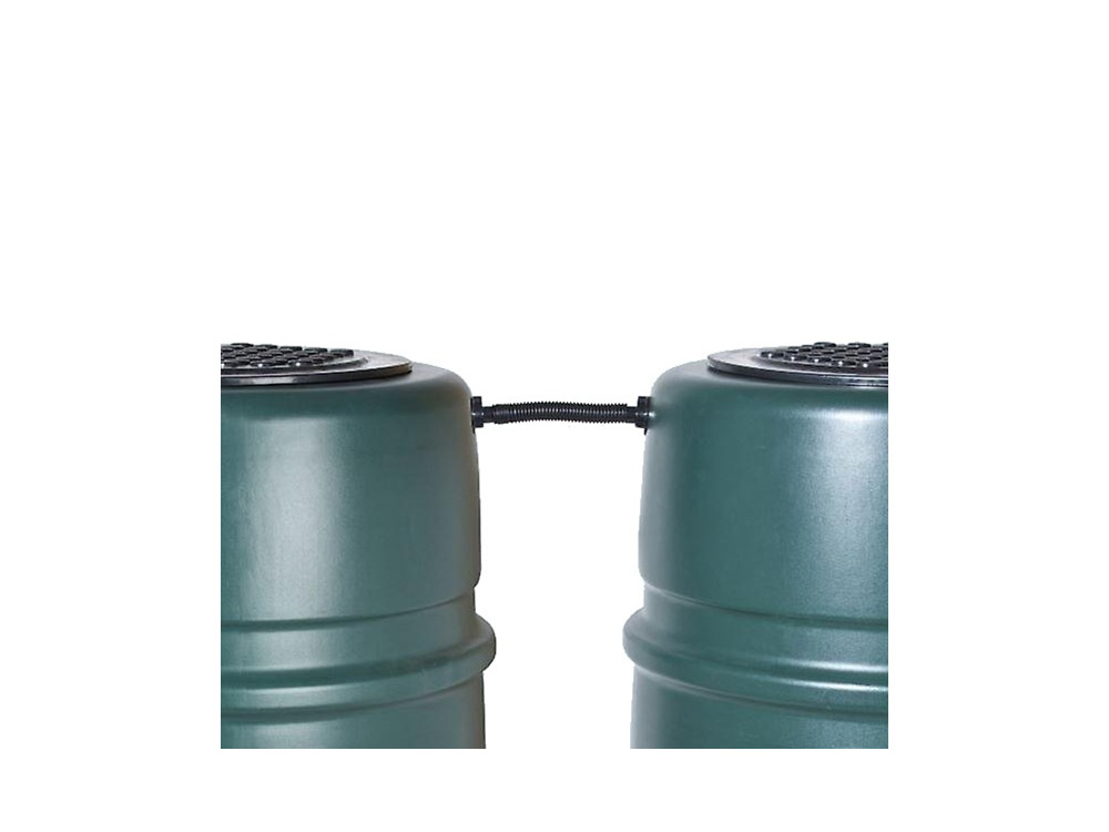 Verbindingsysteem voor nagenoeg alle kunststof regentonnen. Met dit eenvoudig systeem verbind je met gemak twee regentonnen zodat de ene ton in de andere overloopt als ze vol is (verbinding bovenaan).