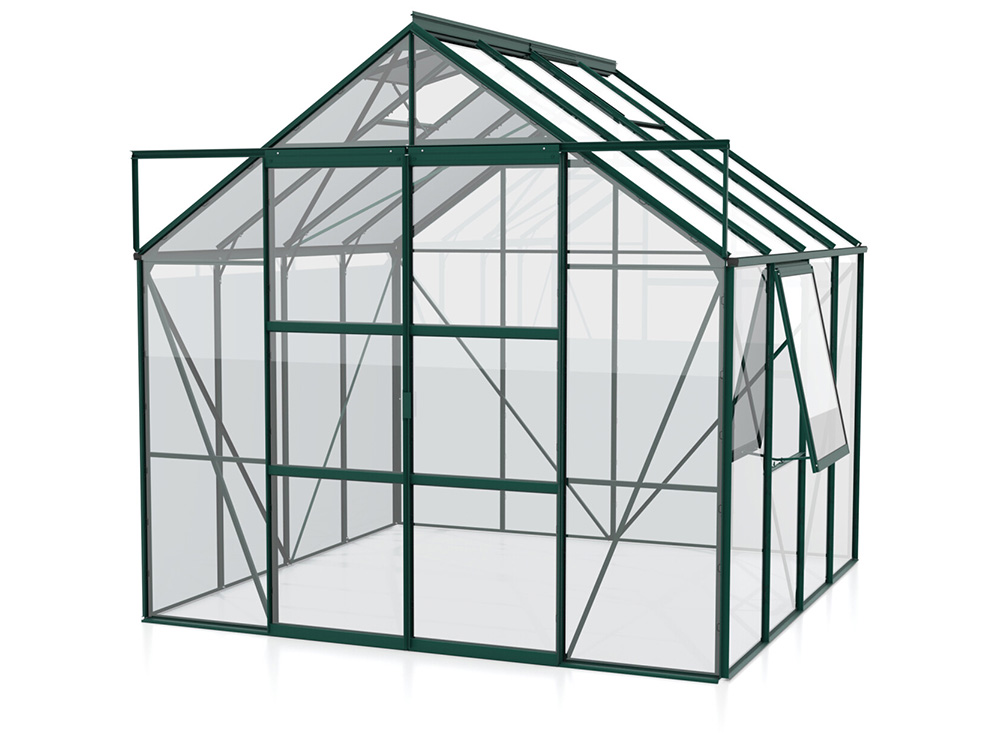Dit topmodel is uitgerust met een dubbele schuifdeur, 2 tot 4 dakramen (afhankelijk van de grootte) en een extra zijvenster, allemaal voorzien van handige uitzetters voor optimale ventilatie. Het frame is vervaardigd uit duurzaam gepoedercoat groen aluminium en afgewerkt met 3 mm veiligheidsglas, wat garant staat voor jarenlang kweekplezier. Voor extra stevigheid is de kas voorzien van hoekplaten en verstevigingen, waardoor je zonder problemen meer gewicht kunt toevoegen.