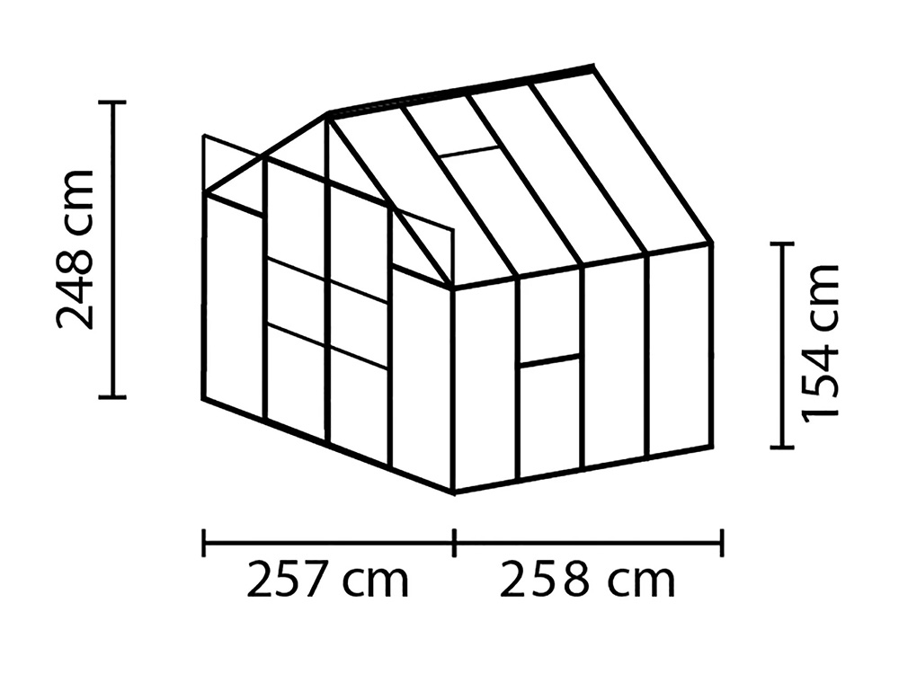 De Jupiter tuinkas van Vitavia biedt de perfecte omgeving om te kweken, zaaien en oogsten. Met een royale breedte van 257 cm en een indrukwekkende hoogte van 248 cm heb je volop ruimte om comfortabel te werken. De dakrandhoogte van 154 cm zorgt bovendien voor extra stahoogte en bewegingsvrijheid.