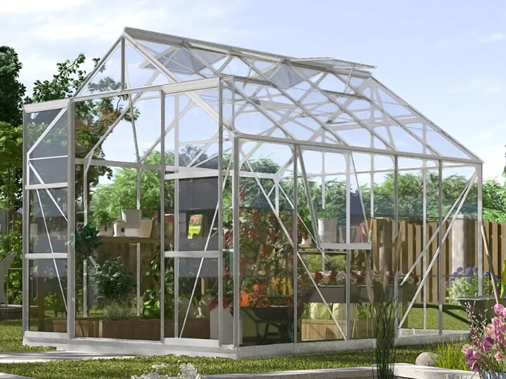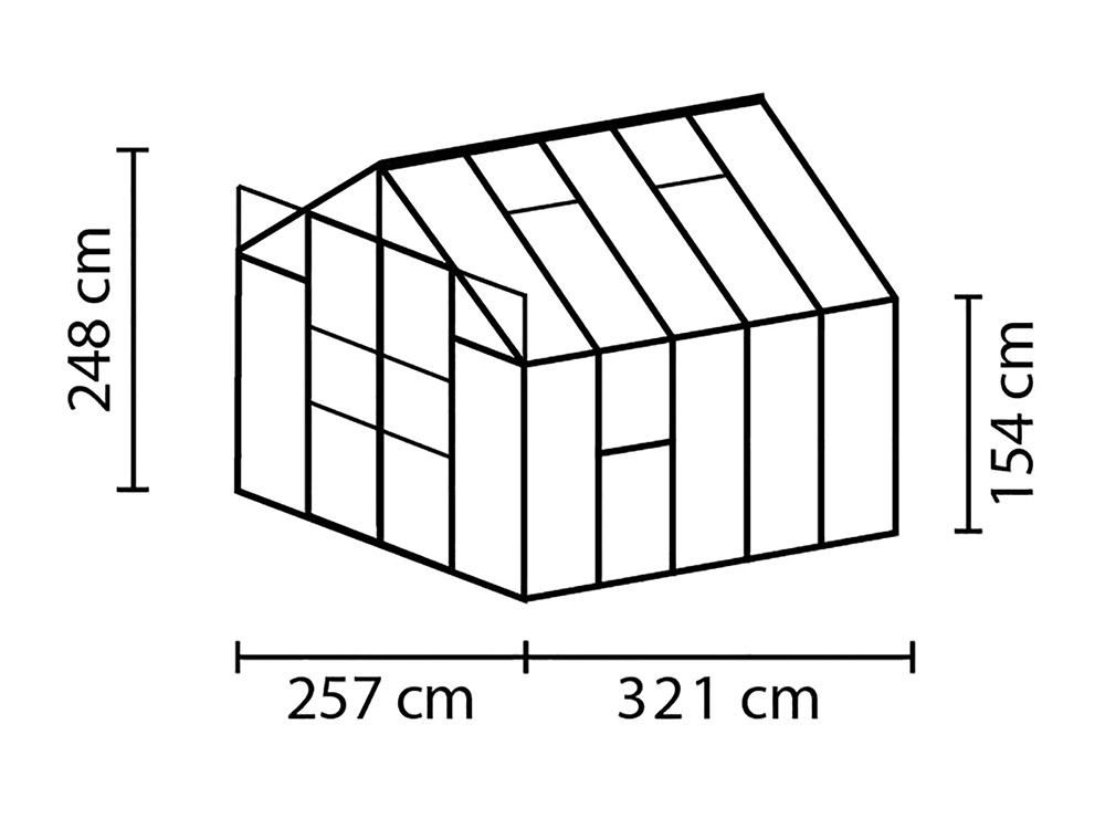De Jupiter heeft een indrukwekkende hoogte van 248 cm en een breedte van 257 cm. Een dakrandhoogte van 154 cm zorgt voor meer stahoogte en werkruimte. Extra stevigheid wordt bereikt door hoekplaten en verstevigingen in de volledige kas, waardoor je ze zonder zorgen zwaarder kunt belasten.
