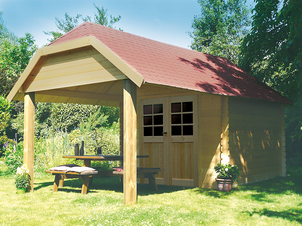 Het Tuinhuis Cork is een traditionele blokhut gemaakt van gecertificeerd Noord-Europees vurenhout met een wanddikte van 28 mm. Het dak is een zadeldak in typische cottage stijl, compleet met herkenbare rode dakpannen. Dit tuinhuis heeft echter een uniek kenmerk, namelijk een grote voorluifel die uitnodigt om te ontspannen.