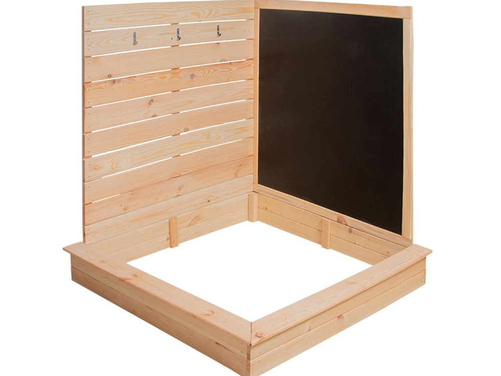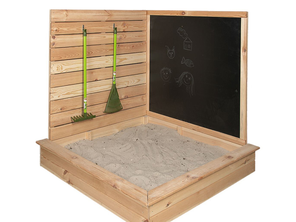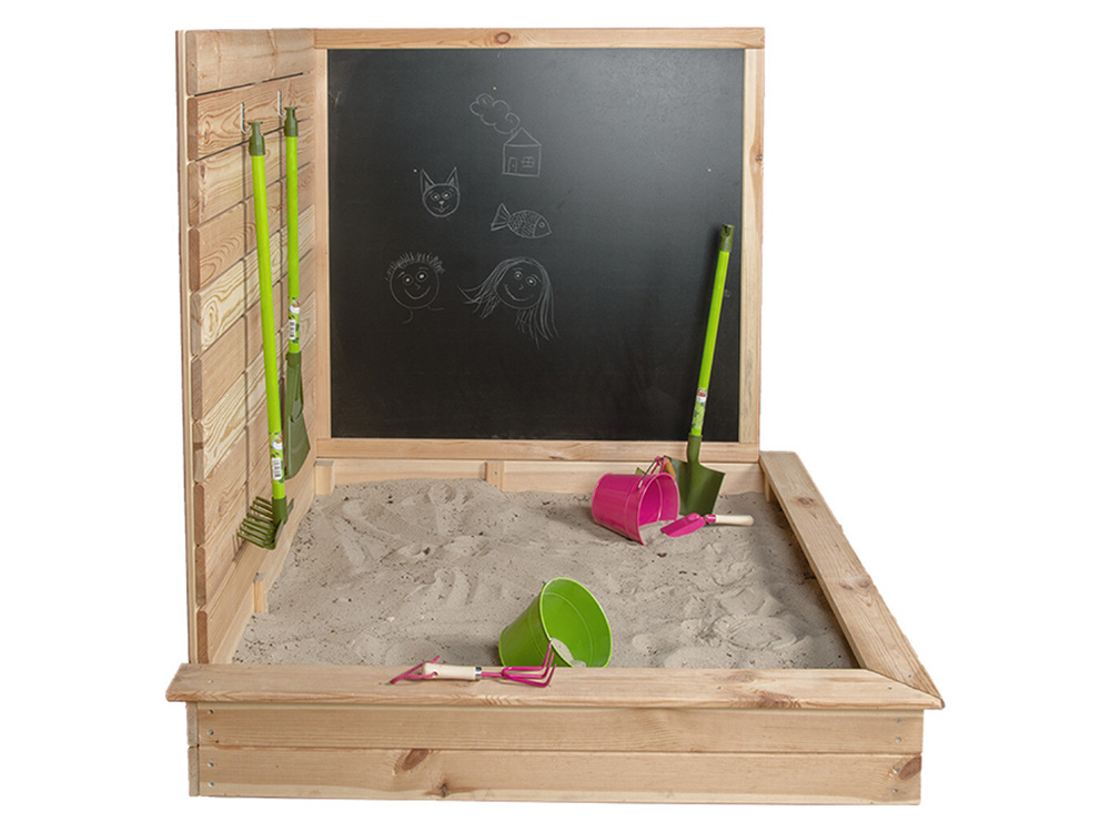 Avontuurlijke verhalen en creativiteit beginnen hier! In deze houten zandbak bouwen kleine ontdekkingsreizigers hun dromen met emmers, schepjes en veel fantasie. En dit is niet zomaar een zandbak; het hoekmodel is uitgerust met twee wanden waarvan één voorzien van een krijtbord. Hier kunnen kinderen hun meesterwerken creëren tussen het spelen door. Laat de verbeelding de vrije loop terwijl tekeningen en vrolijke krabbels de zijkant van de zandbak opfleuren.