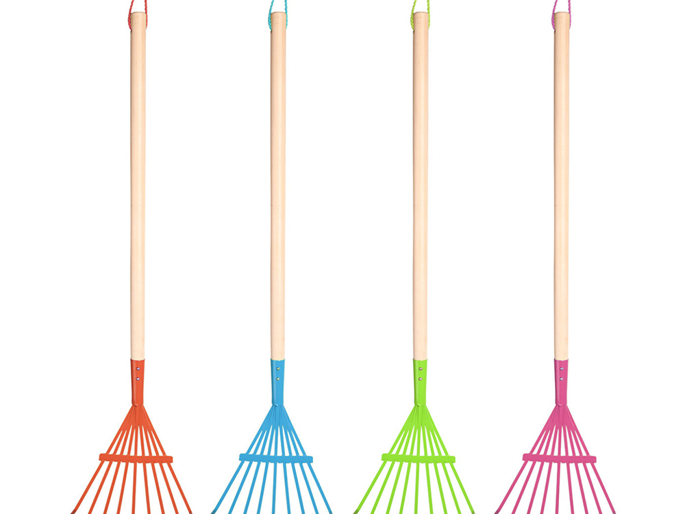 De speelgoed bladhark is beschikbaar in vier verschillende kleuren, dus laat je verrassen!