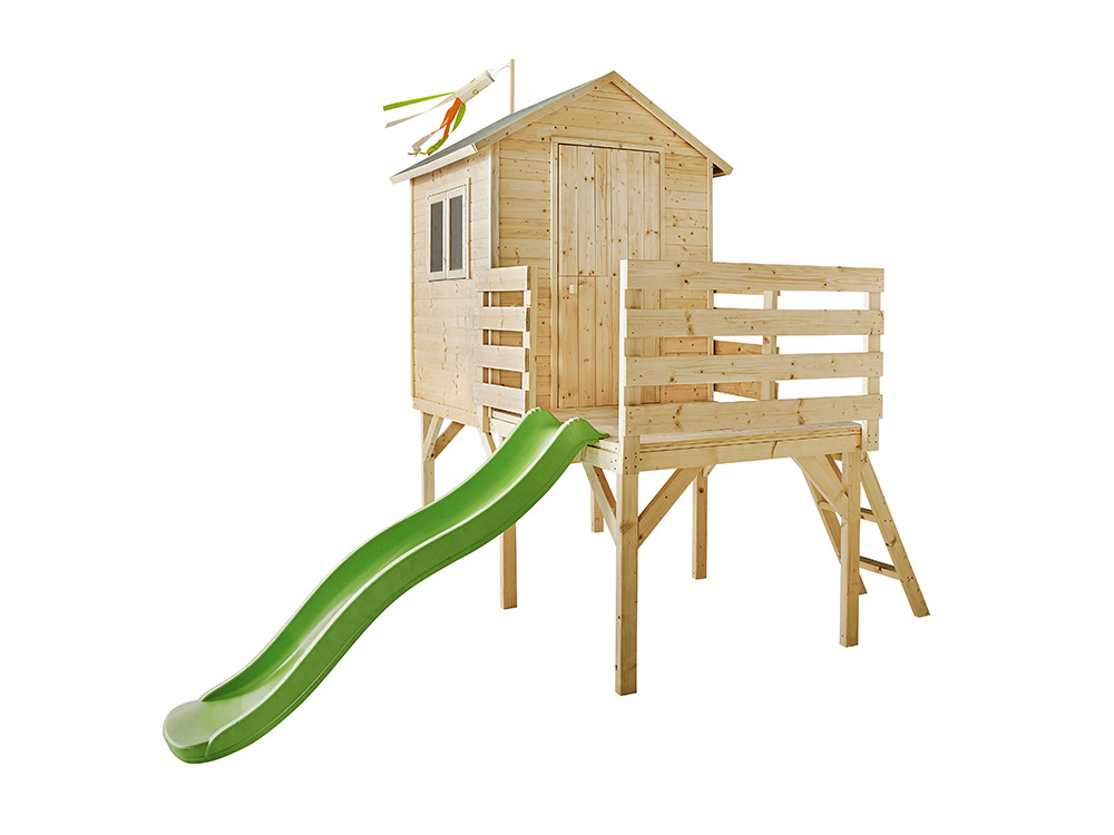 • Houten speelhuis met glijbaan