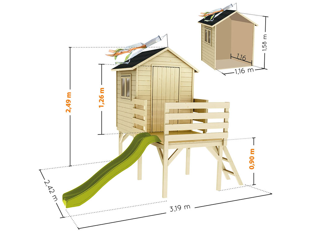Het speelhuis Joséphine is een stevig speelhuis van hout, met een hoogte van 90 cm. Het speelhuisje heeft een veilig omheind terras, dat gemakkelijk te betreden is via een stevige houten ladder. De glijbaan zorgt voor extra plezier en avontuur.