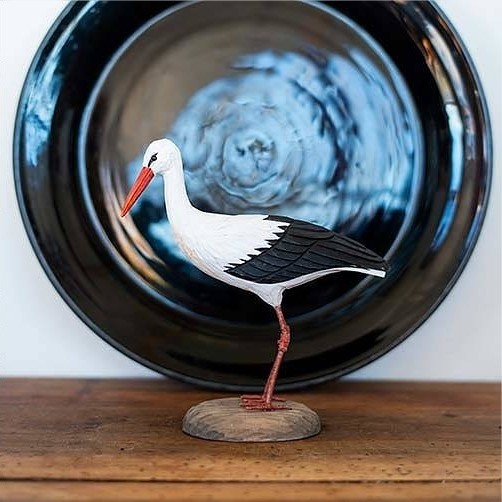 Ambachtelijk vormgegeven houten ooievaar. Deze aantrekkelijke miniatuur ooievaar is beschilderd met milieuvriendelijke verf.