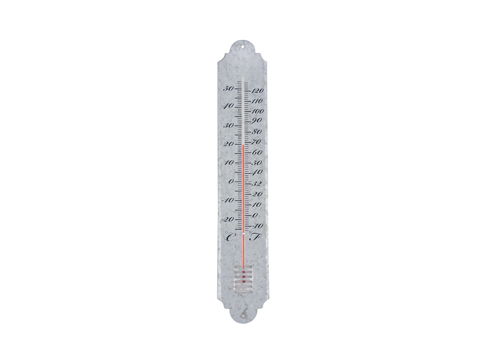 Deze vintage zinken thermometer van Esschert design straalt eenvoud uit en past perfect op elke plek, binnen of buiten. Hij geeft de temperatuur aan in graden Celsius (-25°C tot +55°C) en ook in Farhenheit.