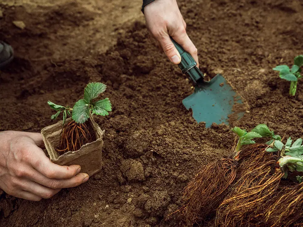 Wanneer je je aardbeien in je moestuin gaat planten, hou je ongeveer 30 cm aan tussen de planten en ongeveer 60 cm tussen de verschillende rijen. Eventueel kan je de planten reeds onderdompelen in water voordat je ze in de grond plaatst. Maak een voldoende breed plantgat en zorg ervoor dat de plant niet te diep staat. De ideale hoogte is wanneer de kroon van de plant net boven het grondoppervlak komt.