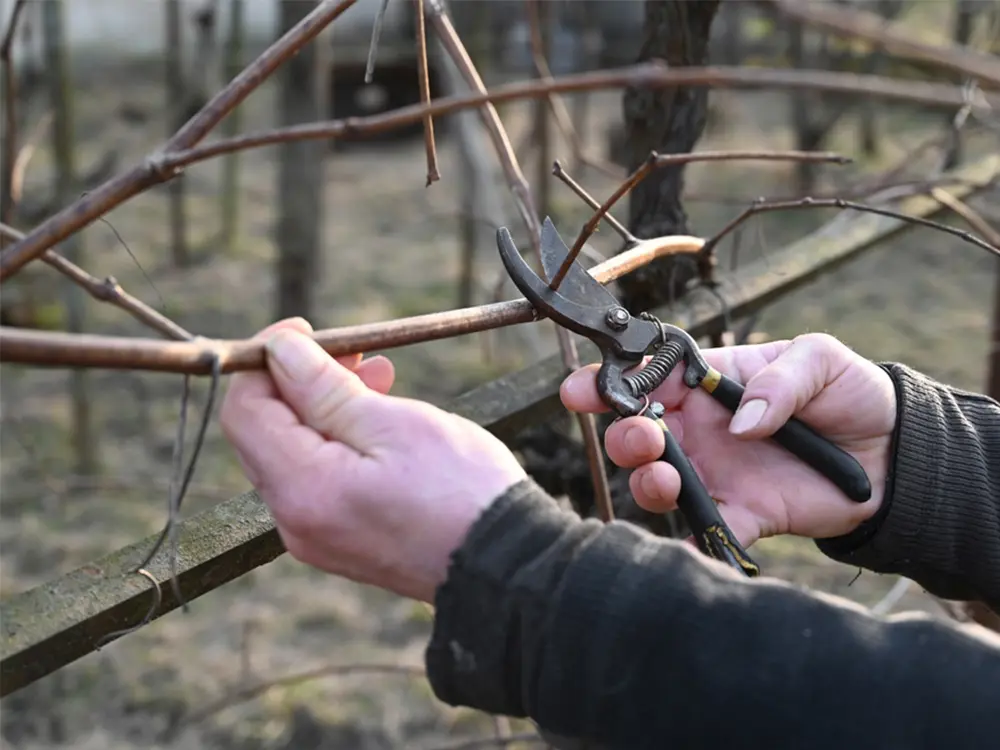Begin met snoeien aan de onderkant van de gesteltak en werk geleidelijk omhoog, tot je de gewenste hoogte van de druivelaar bereikt. Op die manier behoud je het overzicht en kun je snel en efficiënt te werk gaan.