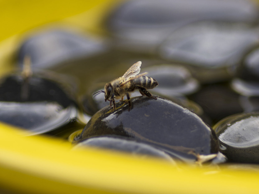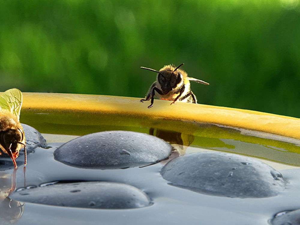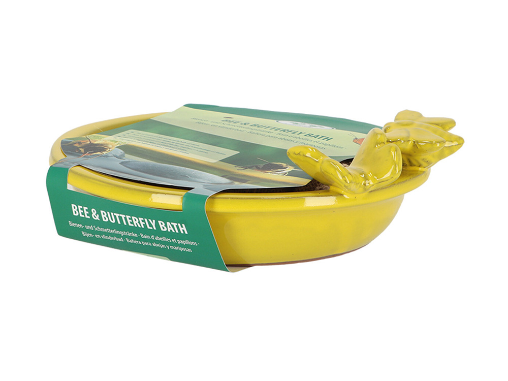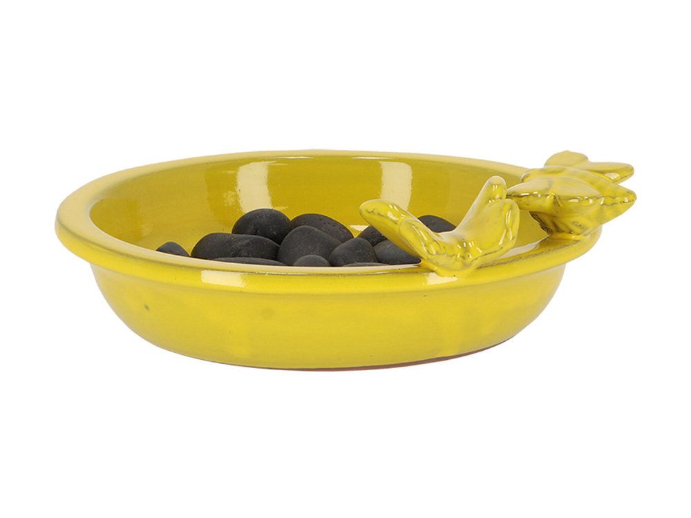 Het prachtig drinkschaaltje wordt geleverd met bijpassende zwarte stenen die je in de schaal kunt leggen. Zo hebben bijen, vlinders en andere insecten steeds een makkelijke landingsplaats. De opvallende gele kleur van de keramieken schaal is bovendien zeer aantrekkelijk voor onze kleine vrienden.