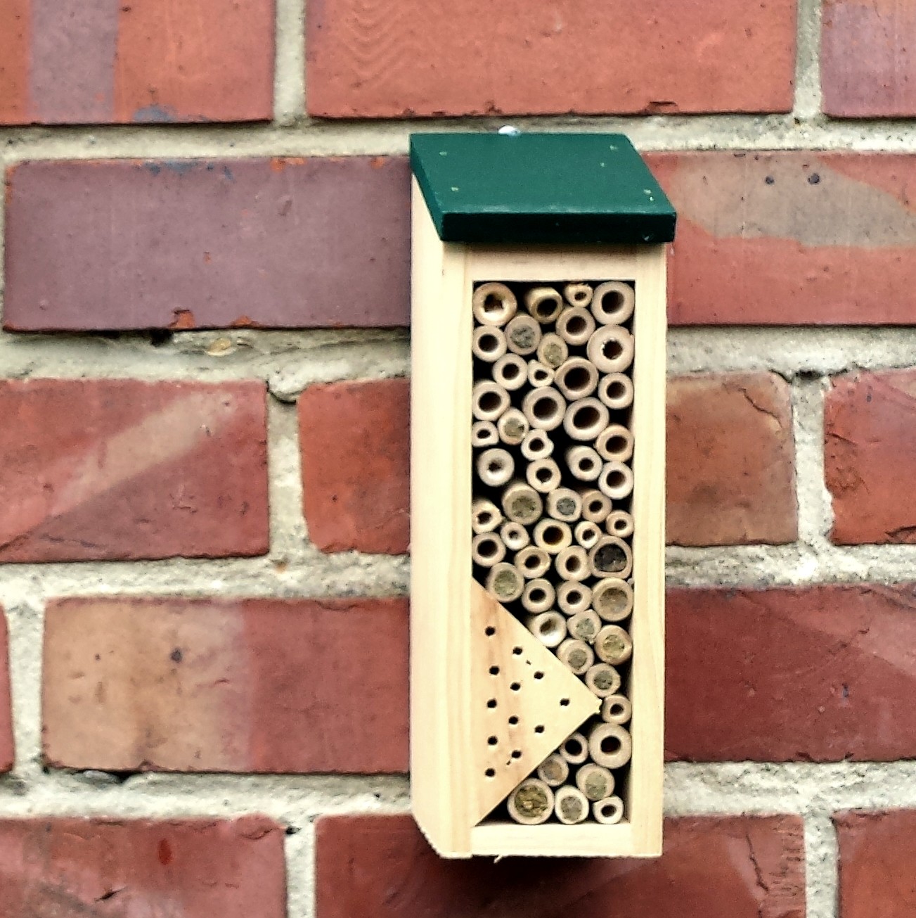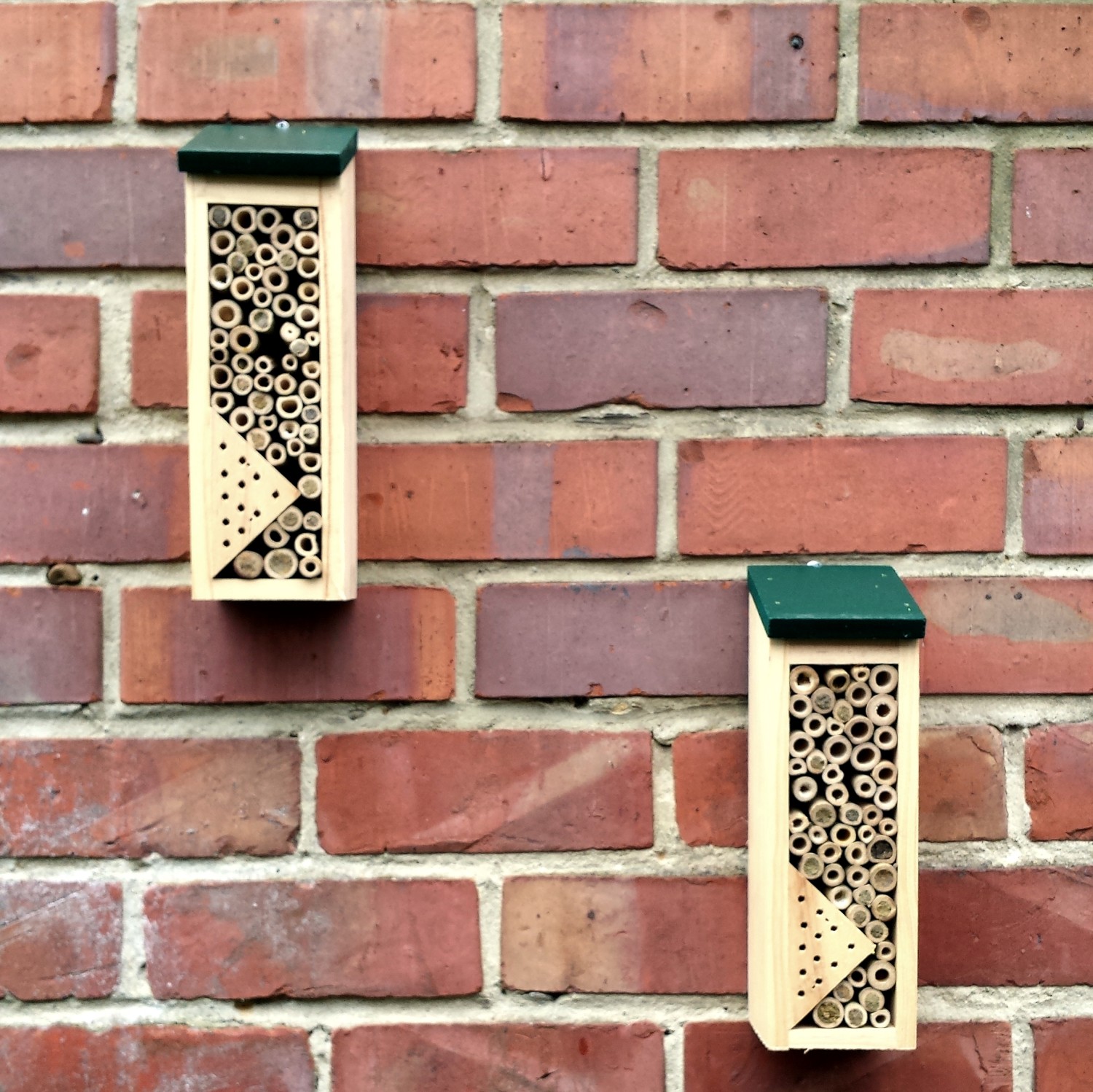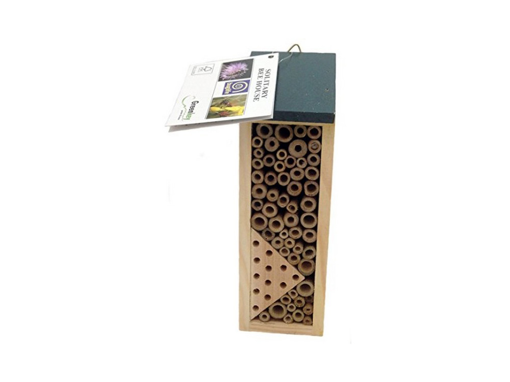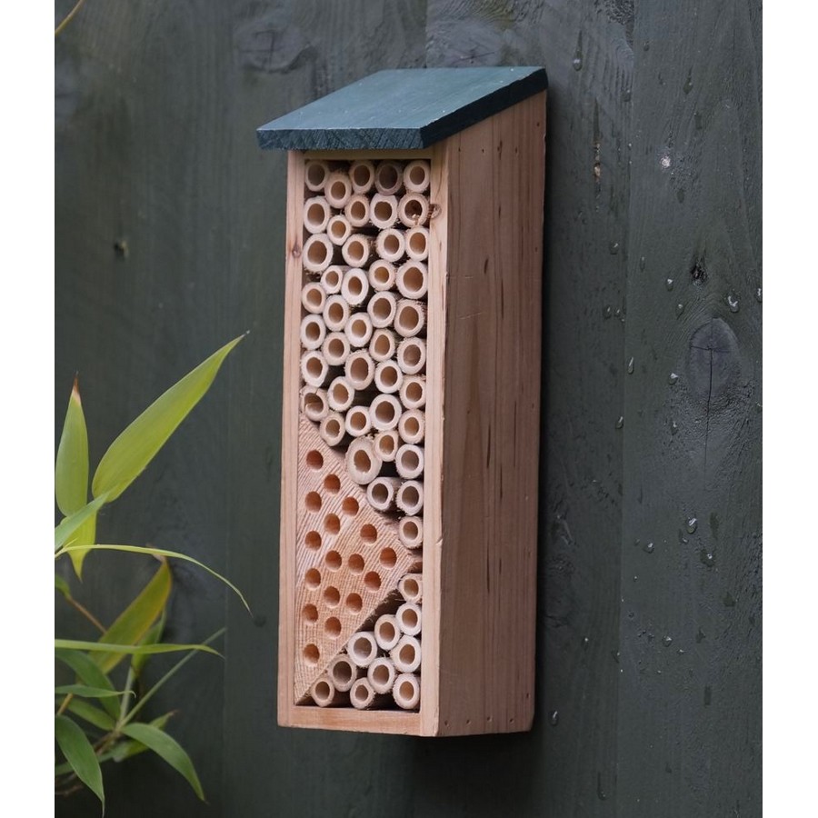 Deze bijenchalet is speciaal ontworpen om een veilige nestelplek te bieden aan solitaire bijen. De bamboebuisjes hebben de ideale afmetingen voor deze nuttige insecten, en de driehoek van hout geeft insecten een veilige plek.