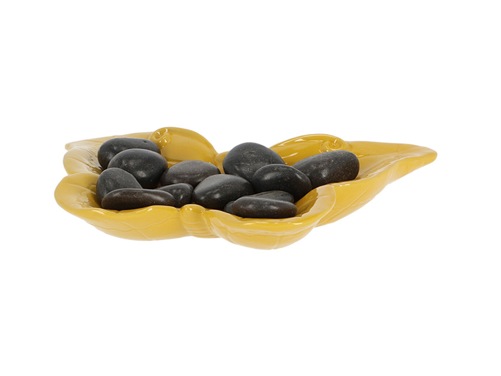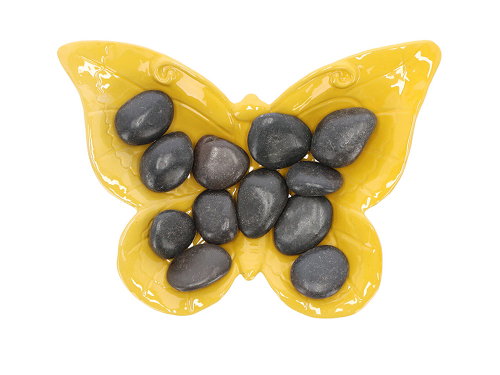 Het prachtig drinkschaaltje wordt geleverd met bijpassende zwarte stenen die je in de schaal kunt leggen. Zo hebben bijen, vlinders en andere insecten steeds een makkelijke landingsplaats. De opvallende gele kleur van de keramieken schaal is bovendien zeer aantrekkelijk voor onze kleine vrienden.