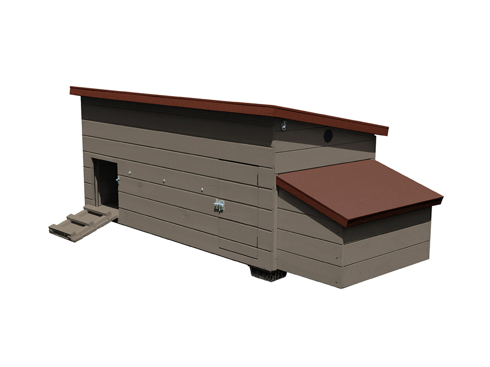 Bungalow Large is ons grootste model met plat dak, dit ruime hok is geschikt voor 4 grote tot 8 middelgrote kippen en is bovendien met een handige extra deur een de voorzijde.