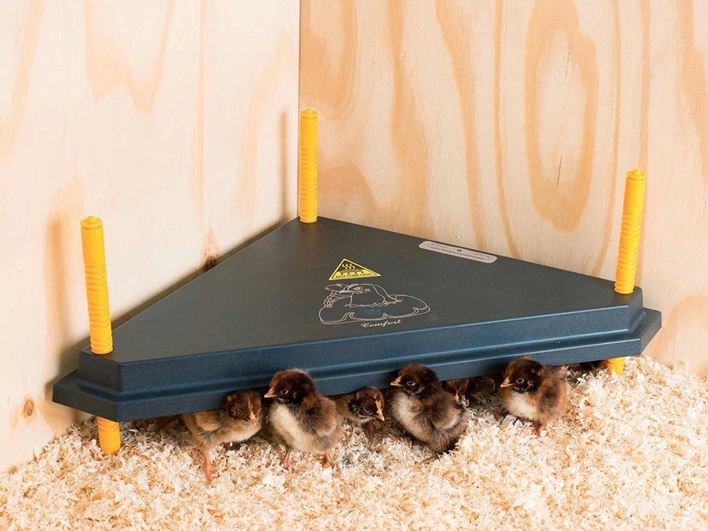 Het hoekvormig model van 40 x 40 cm is geschikt voor 20 tot 25 kuikens.