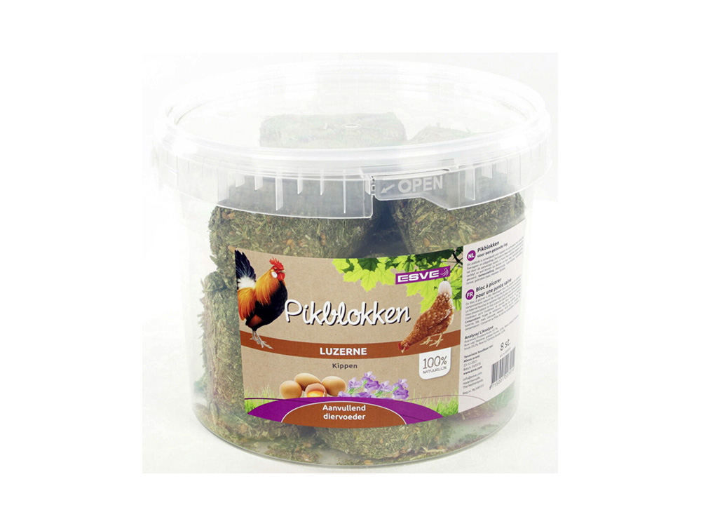 Deze pikblokken zijn samengesteld met 100% natuurlijke ingrediënten. Speciaal ontwikkeld voor kippen om het natuurlijk foerageer- en pikgedrag te stimuleren. Luzerne, een vezelrijke plant, bevordert hierbij een goede spijsvertering.