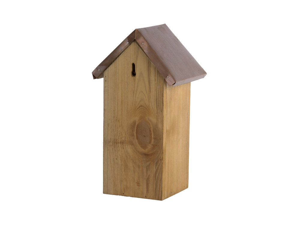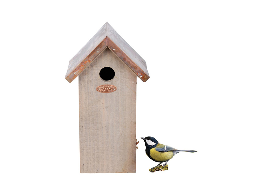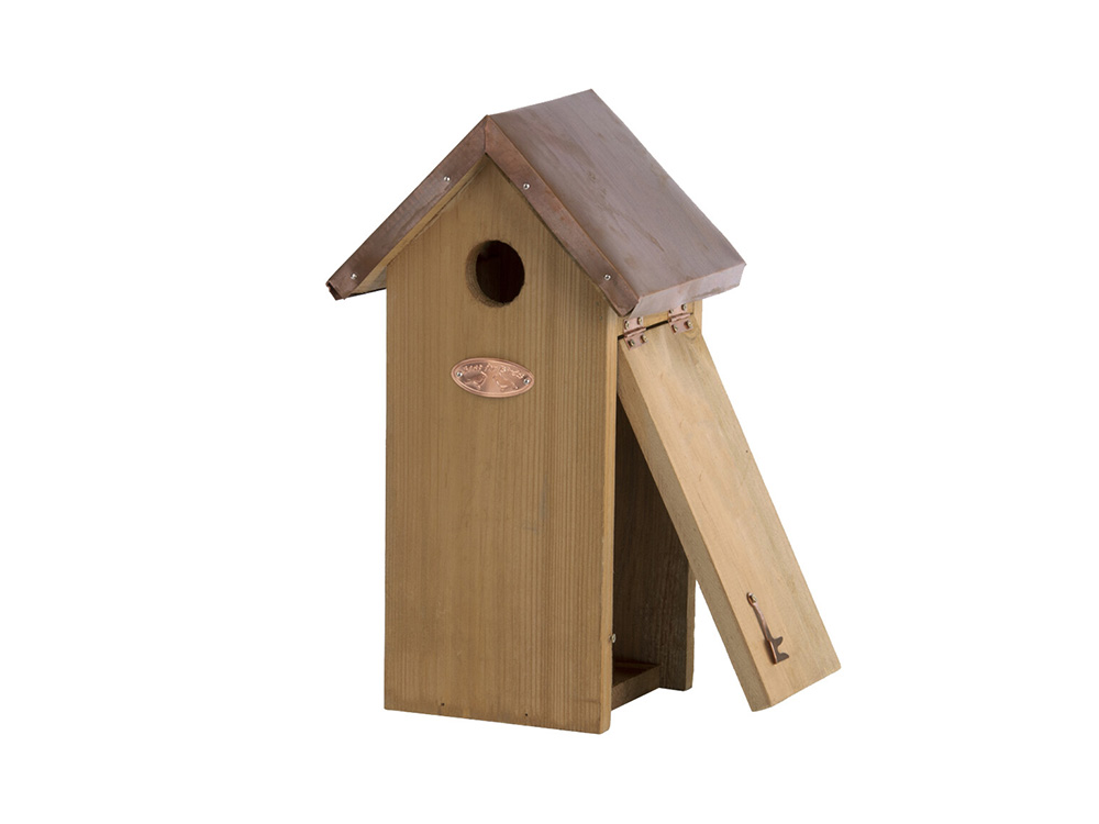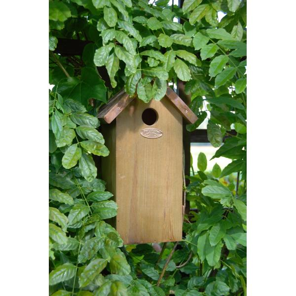 Mooie nestkast met een standaard invliegopening van 32 mm die geschikt is voor koolmezen, mussen en de occasionele bonte vliegenvanger. Deze traditionele nestkast heeft een landelijke uitstraling en is voorzien van een waterdicht koperen dak.