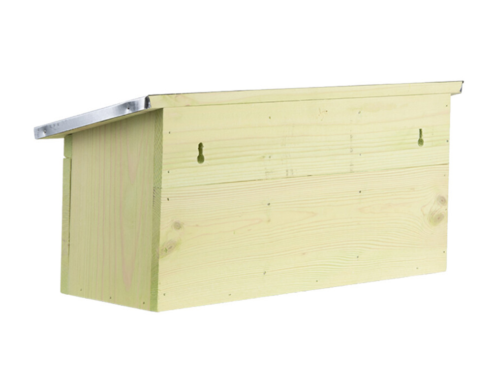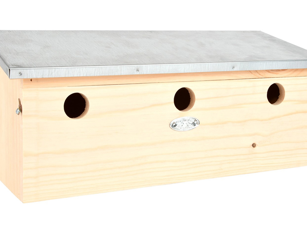 Deze mussenflat is voorzien van een zinken dak om het hout te beschermen. De voorzijde van de nestkast draait open om ze grondig te kunnen reinigen.