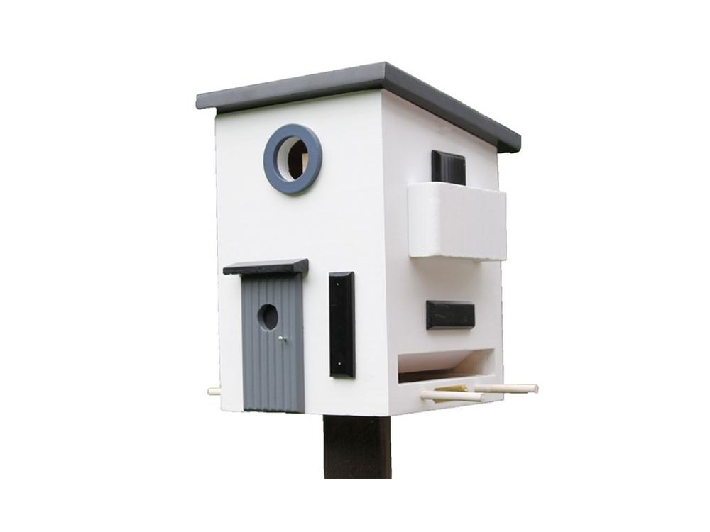 Vogelhuis en voederhuis onder 1 dak ontworpen naar het model van de moderne woningen met een minimalistisch design zoals men ze ziet in Scandinavië.