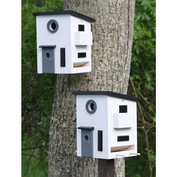 Het huisje bevat een 2- liter reservoir voor vogelvoer. Het compartiment is middels een scheiding in twee delen op te delen waardoor 2 soorten voedsel kunnen gebruikt worden. Dit maakt het vogelhuisje tot een druk bezochte voederplaats van vele soorten vogels. De voederopeningen zijn bereikbaar via kleine stokjes die enkel toegankelijk zijn voor kleine tuinvogels. De ronde invliegopening kan in één seconde dicht gedraaid worden op het moment dat het huisje als voedersilo dienst doet.