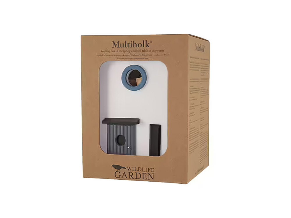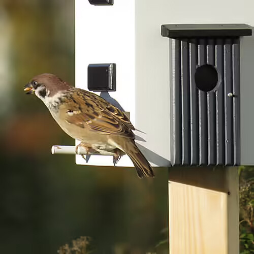 Het scheidingswandje tussen de twee voedselcompartimenten kan in een handomdraai verwijderd worden en dient vervolgens als bodem voor het nestkastje. De ronde invliegopening (32 mm) is groot genoeg voor mezen zoals de koolmees of kleinere soorten. De ingang is gemaakt van hardhout en biedt zo bescherming tegen spechten. De binnenkant van het vogelhuisje is voorzien van kleine inkepingen die de jonge vogeltjes voldoende houvast bieden om het nest te verlaten als het zover is. Het huisje is voorzien van voldoende ventilatie om een aangenaam klimaat tijdens warme dagen te waarborgen.