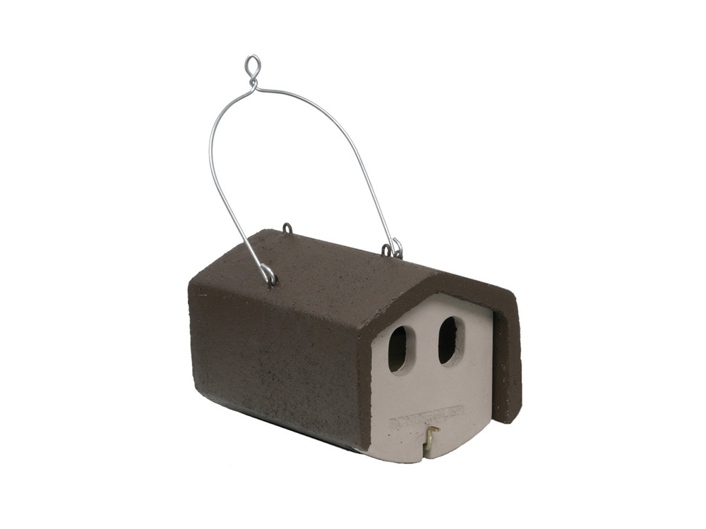 Nestkast in houtbeton met twee invliegopeningen, Ø 30 x 50 mm. De twee ovale invliegopeningen zorgen voor voldoende lichtinval gezien de diepte van deze nestkast. Door de hoeveelheid licht zal het nest diep en achterin de kast, voorbij de houten roofdierbescherming, worden gebouwd.