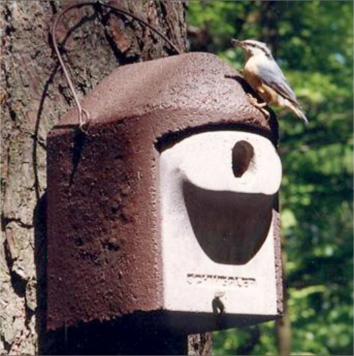 Nestkast in houtbeton met één ovalen invliegopening, 30 x 45 mm. De vorm van de invliegopening zorgt voor voldoende lichtinval gezien de grootte van deze nestkast. Door de hoeveelheid licht zal het nest diep en achterin de kast worden gebouwd, ver weg van eventuele roofdieren.