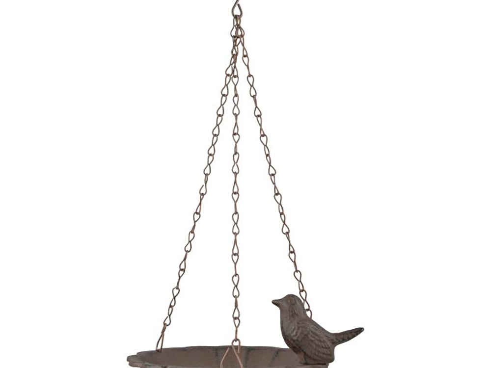 Een hangend vogelbad van Esschert design, gemaakt van gietijzer en versierd met een charmant vogeltje op de rand. Het vogelbad wordt geleverd met drie ophangkettingen en een ophanghaak.