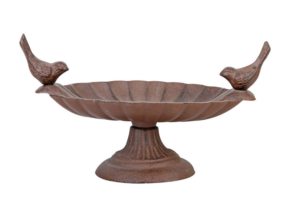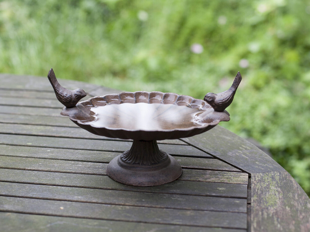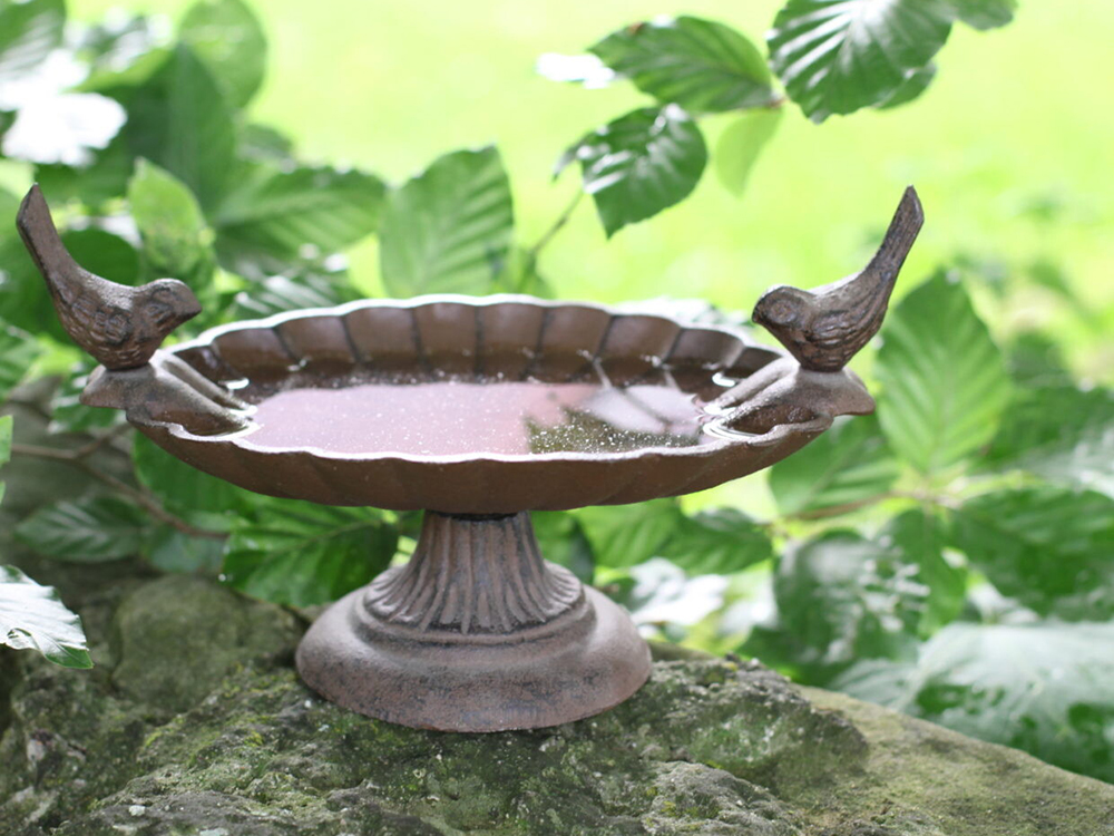 Twee decoratieve vogels hebben zich al op de rand van het gietijzeren schaaltje gesetteld, een uitnodiging voor anderen om snel te volgen. Dit mooie antiek roestbruine gietijzeren vogelbad leent zich ook perfect als voederschaal.