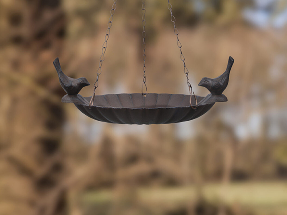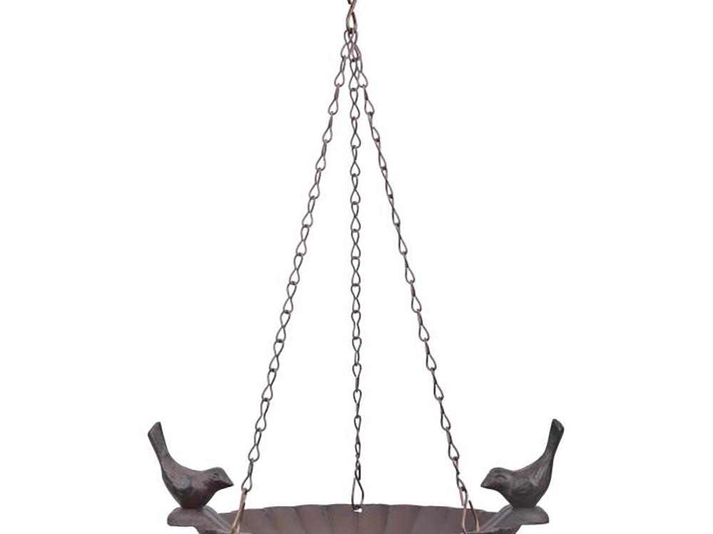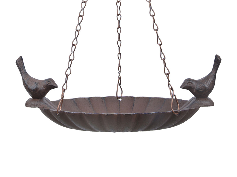 Een gietijzeren, hangend vogelbad van Esschert design versierd met twee schattige vogeltjes op de rand. Compleet met drie ophangkettingen en een ophanghaak.