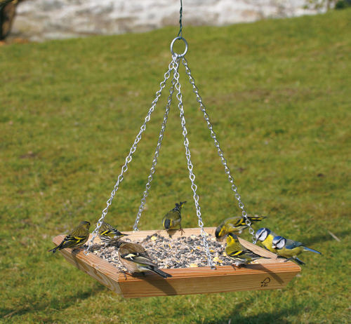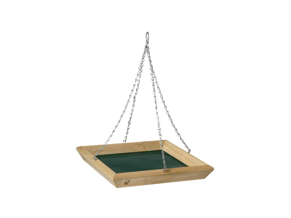 Deze houten voedertafel is voorzien van een bodem in gaasdraad en een stevige ophangketting.