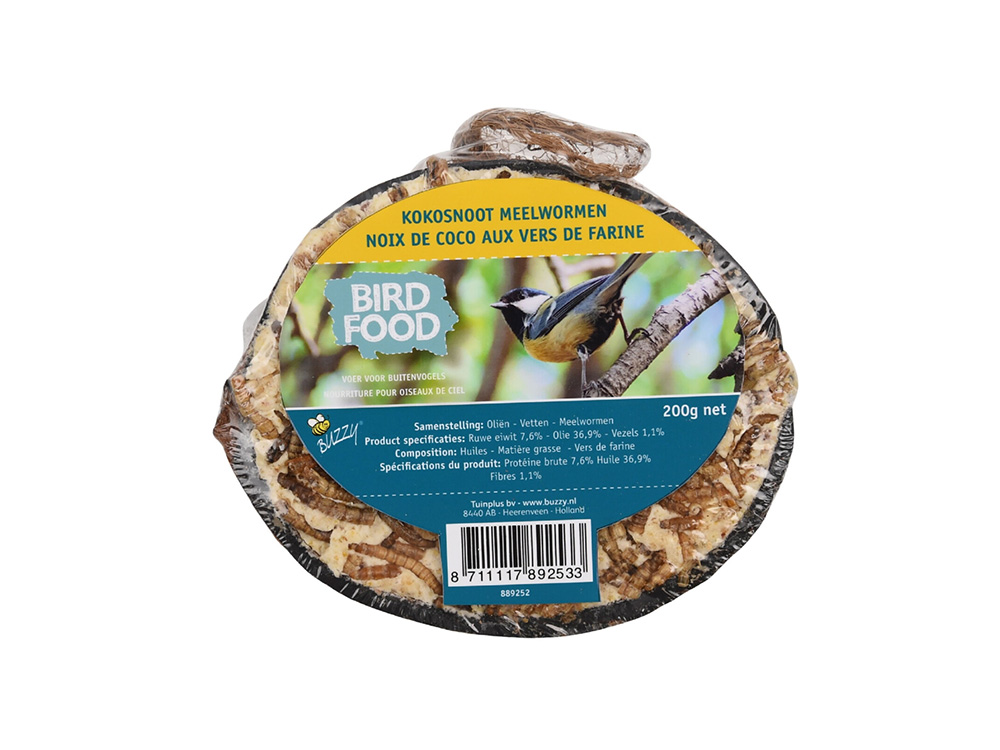 Deze halve kokosnoot bevat een energierijke mix van meelwormen, oliën en vetten waar onze gevleugelde tuinvrienden dol op zijn. Vogels kunnen gemakkelijk op de kokosnoot blijven zitten terwijl ze eten, en ze gebruiken graag de kokosvezels aan de buitenkant als nestmateriaal.
